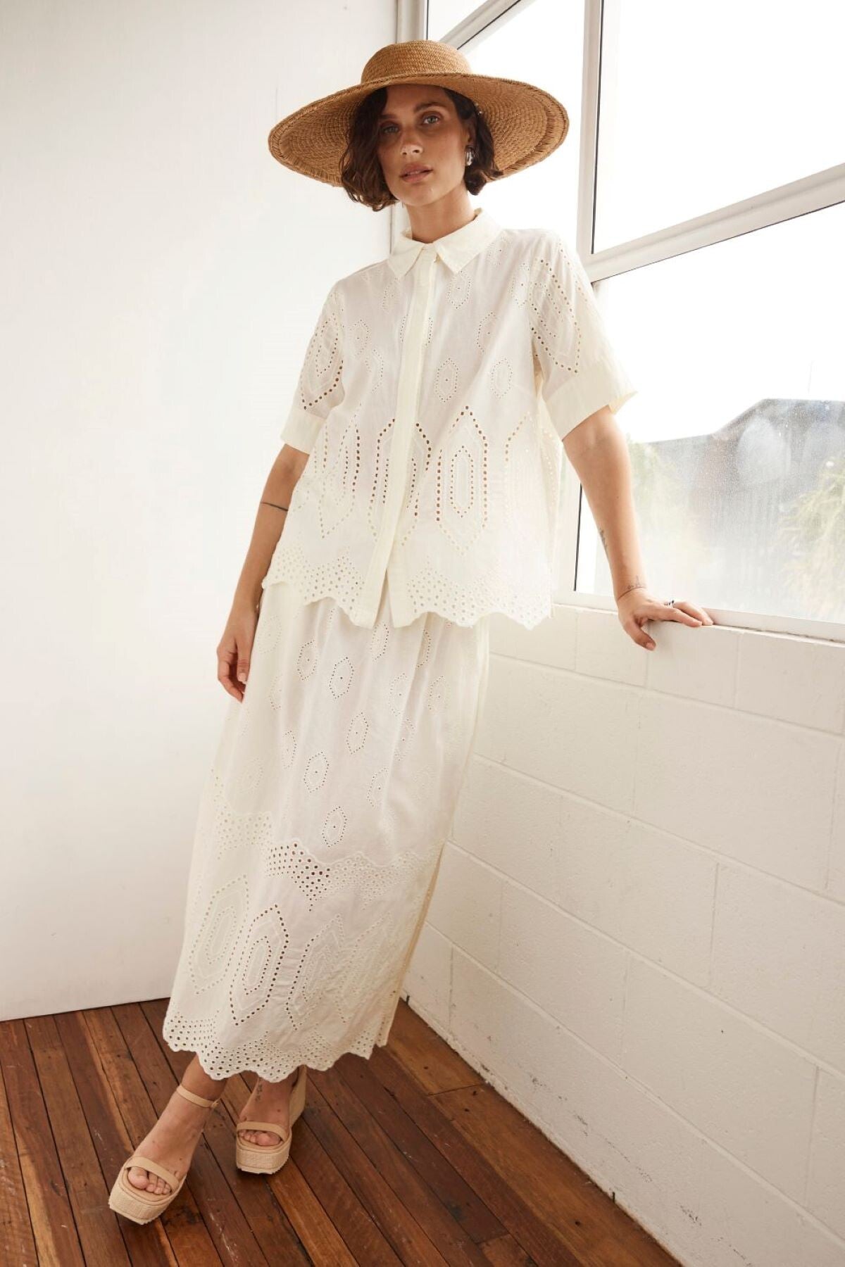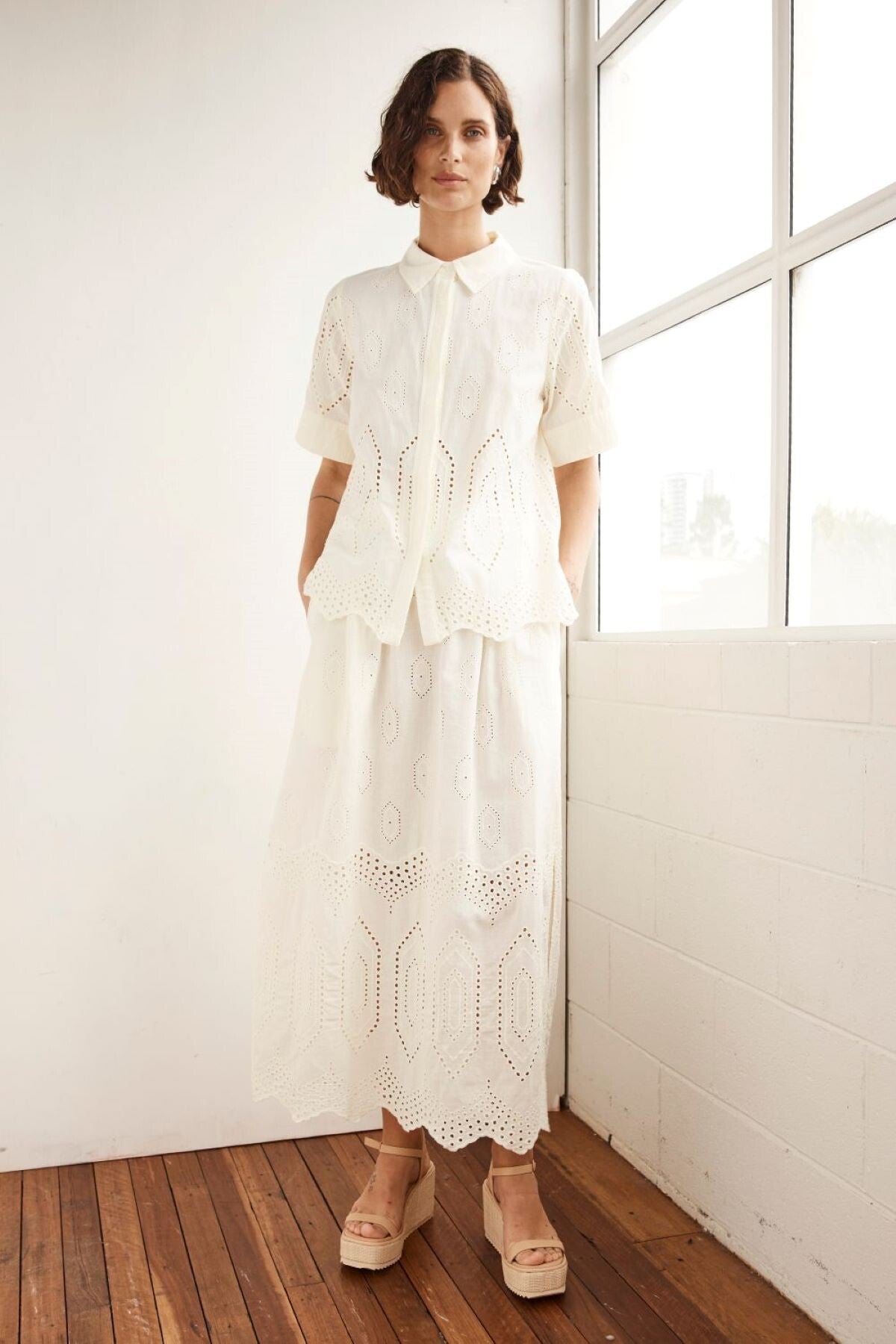 SIZE ON TAG: 1FITS LIKE: 10-12COLOUR: WhiteFABRIC: 55% ramie, 45% cottonCONDITION: Excellent prelovedMEASUREMENTS:WAIST: 38cms HIPS: 65cms LENGTH: 94cms NOTES: The fond skirt is a unique and stylish...