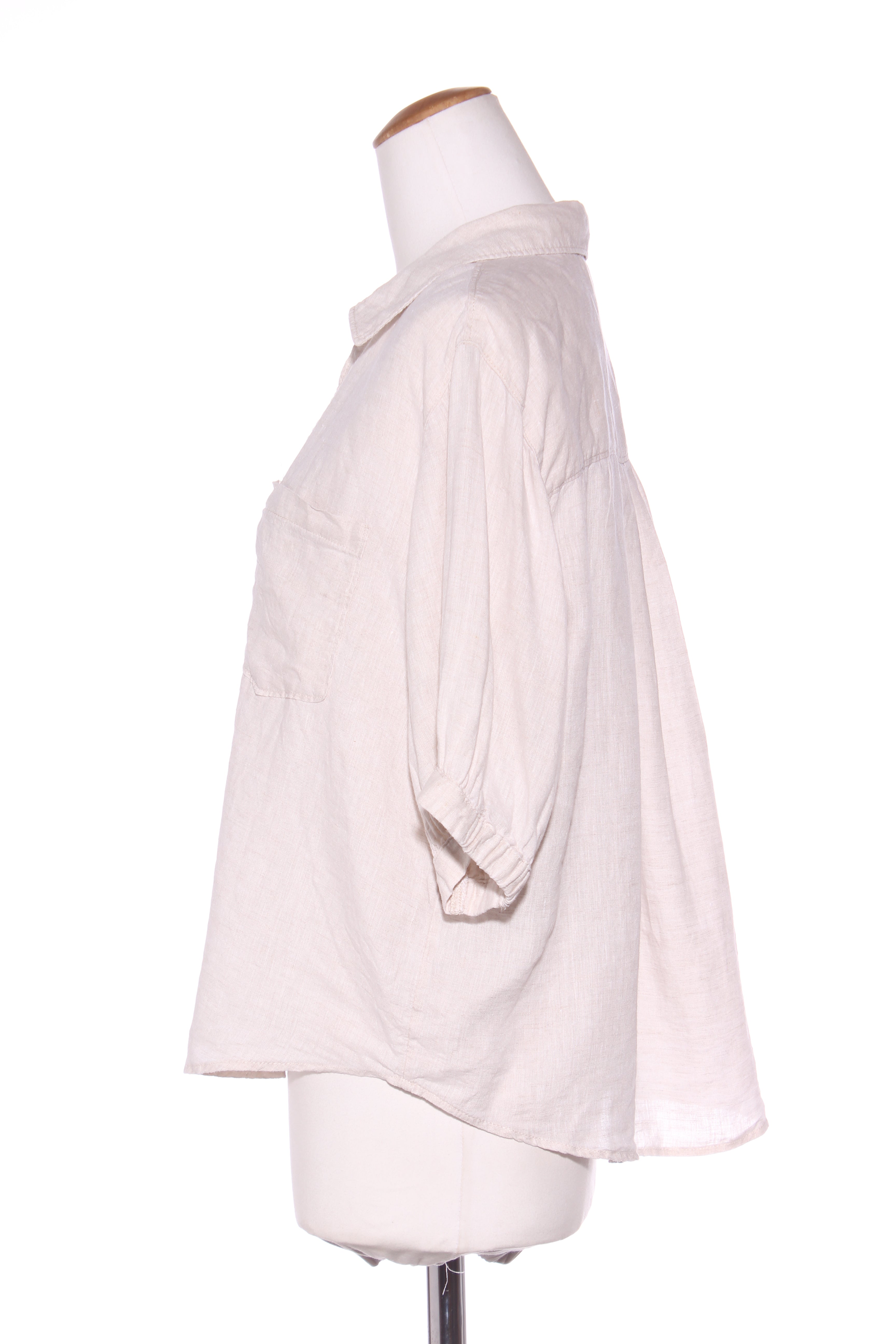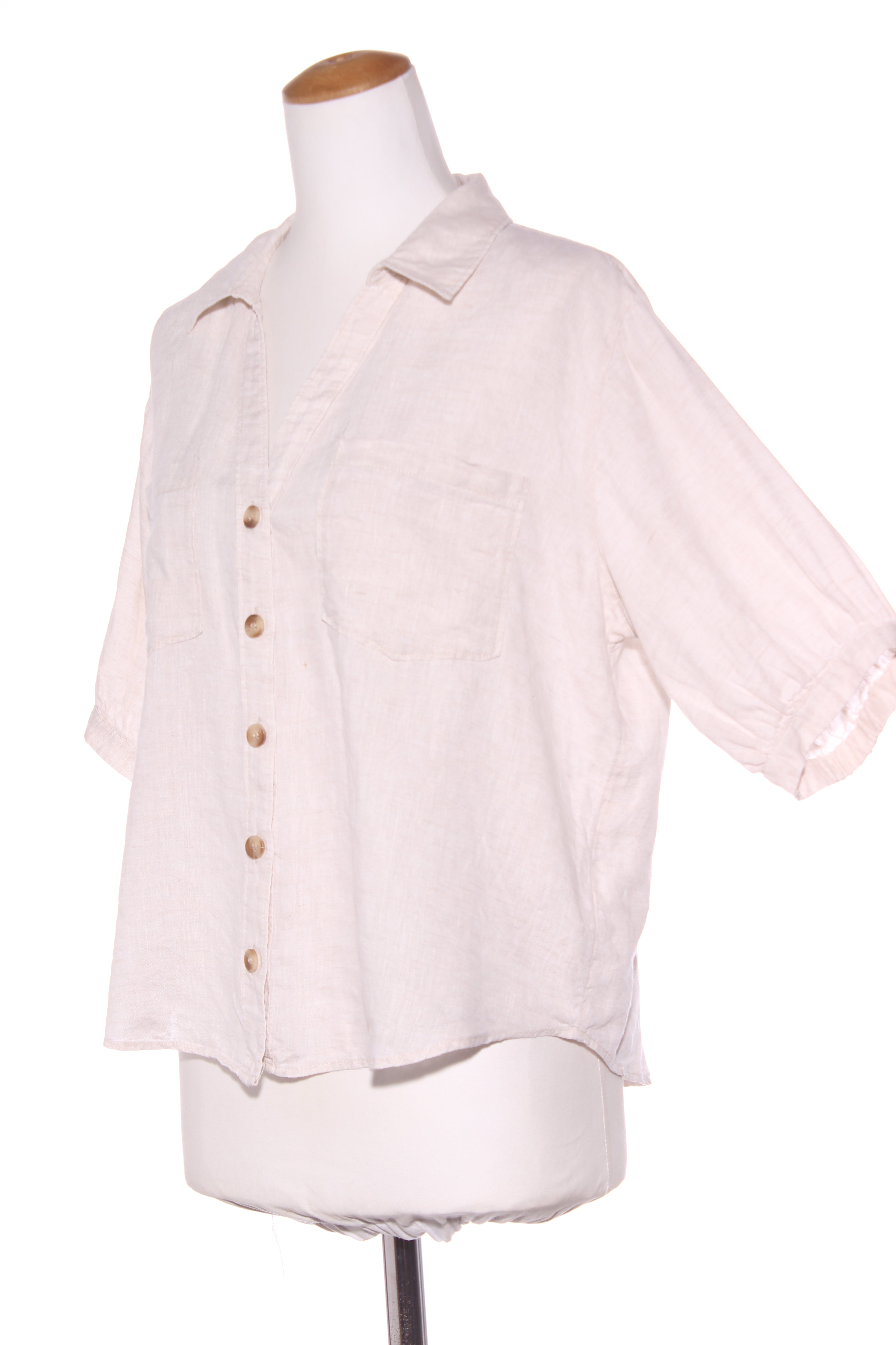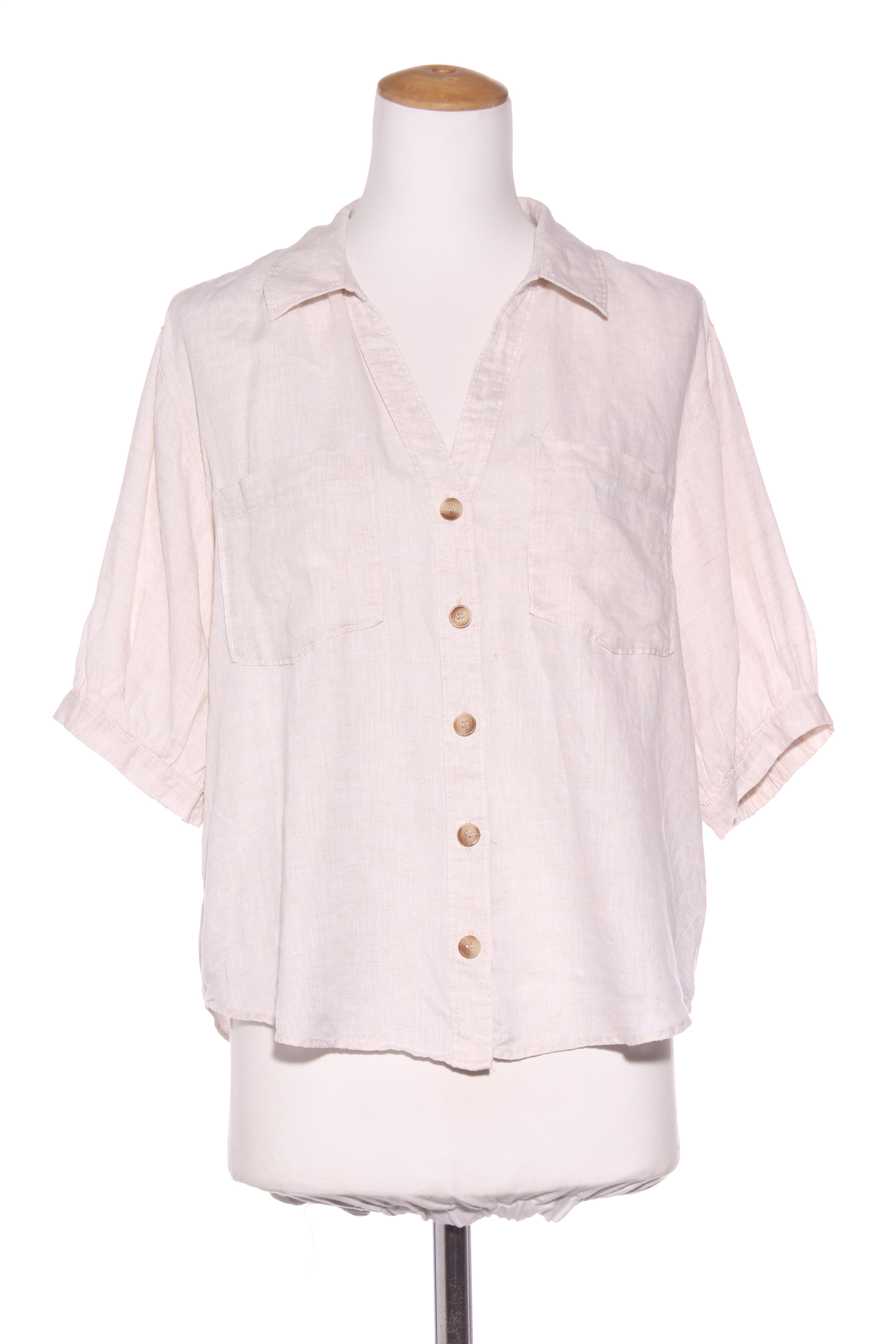 SIZE ON TAG: 12FITS LIKE: N/ACOLOUR: OatmealFABRIC: LinenCONDITION: Excellent prelovedMEASUREMENTS:BUST: 52cms WAIST: 38cms LENGTH: 46cmsNOTES: Crop blouse with puff sleeves and an exaggerated opening at the...