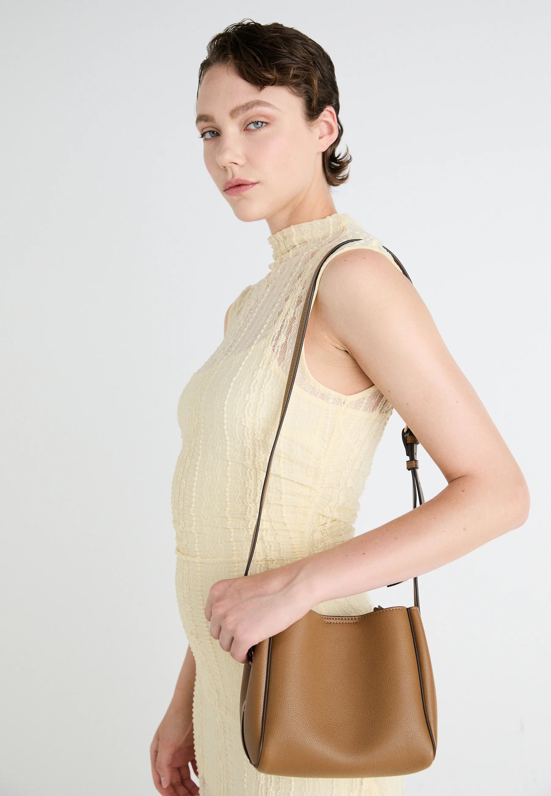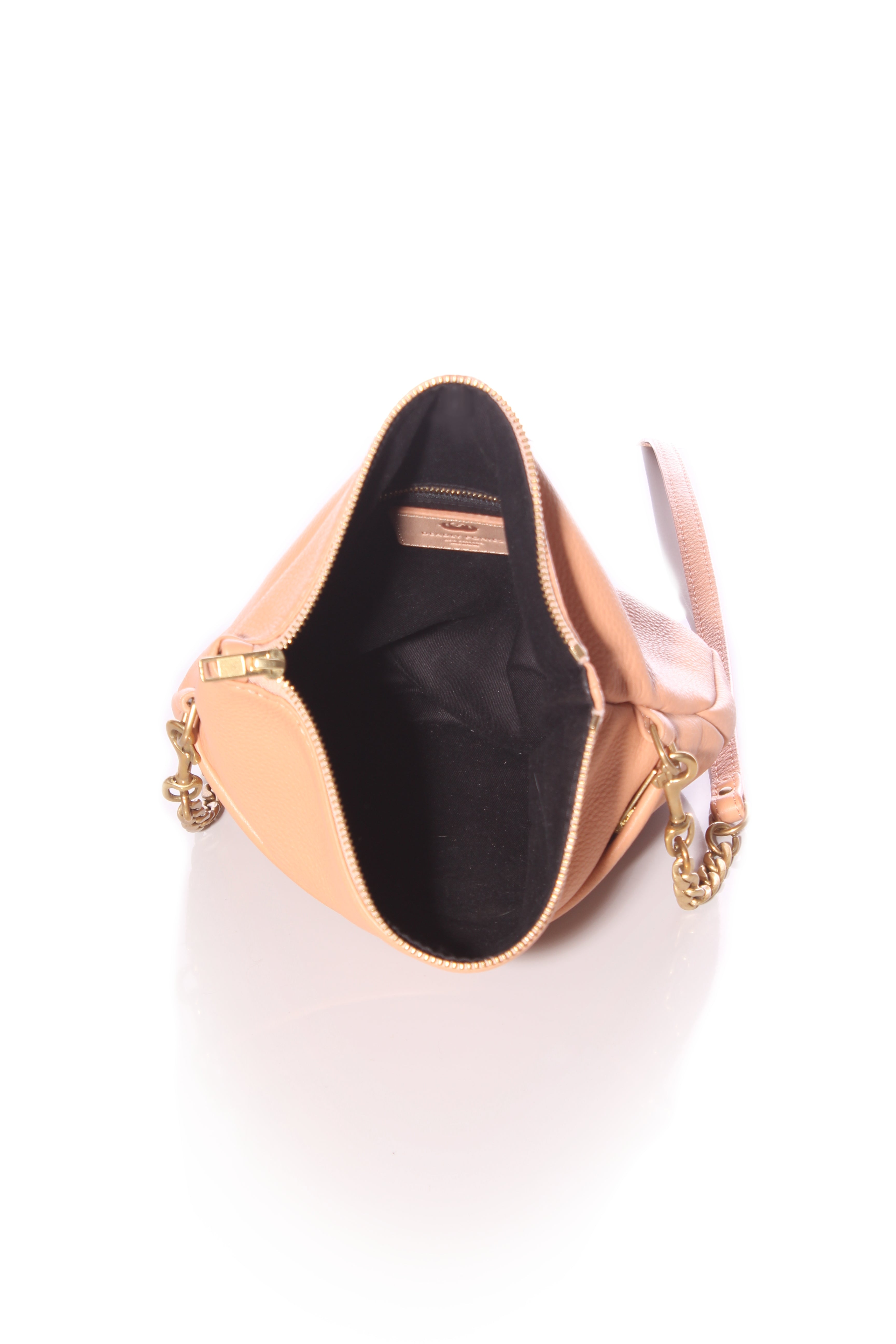 COLOUR: Peach caramelFABRIC: Leather, textile lining, brassCONDITION: Excellent prelovedMEASUREMENTS:HEIGHT: 19cms WIDTH: 26cms DEPTH: 5cms STRAP: 111-129cms NOTES: Buttery Ironed Calf Nappa shapes the slimline...