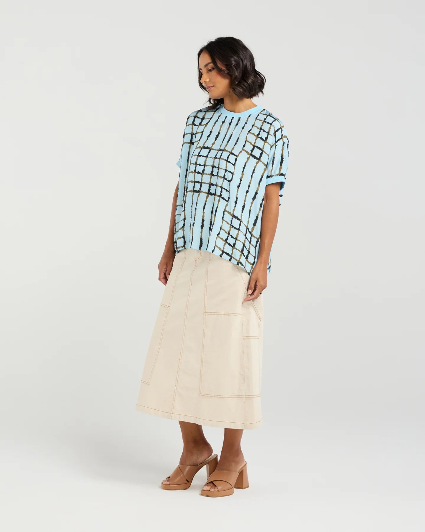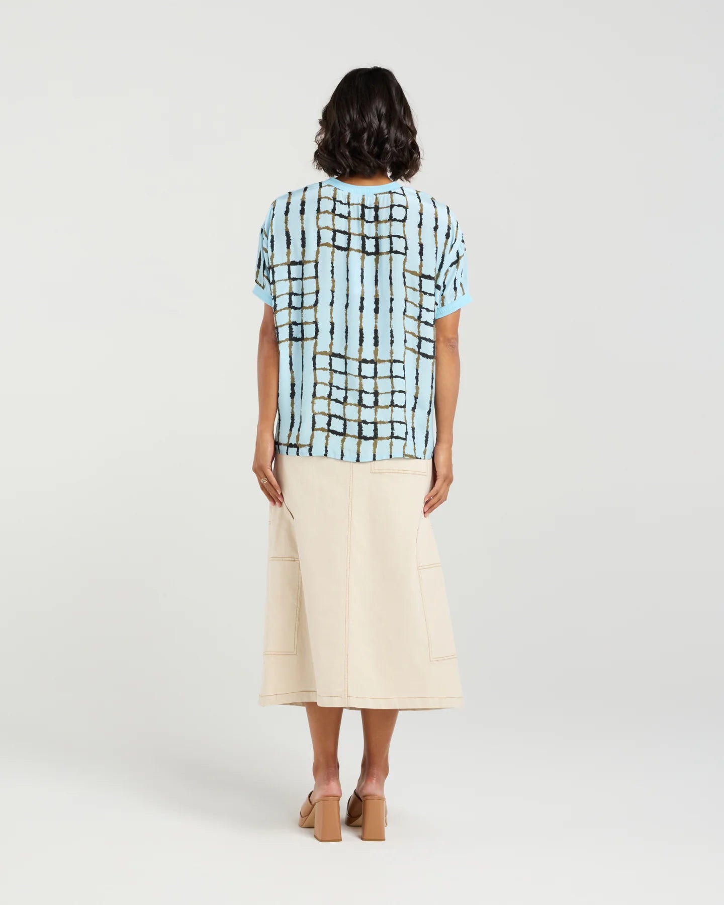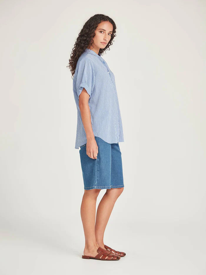 SIZE ON TAG: 14FITS LIKE: N/ACOLOUR: Blue, whiteFABRIC: 85% viscose, 15% polyamide CONDITION: Like newMEASUREMENTS:BUST: 62cms WAIST: 61cms LENGTH: 70-74cmsNOTES: * Current seasonThe Flynn Stripe Shirt features...