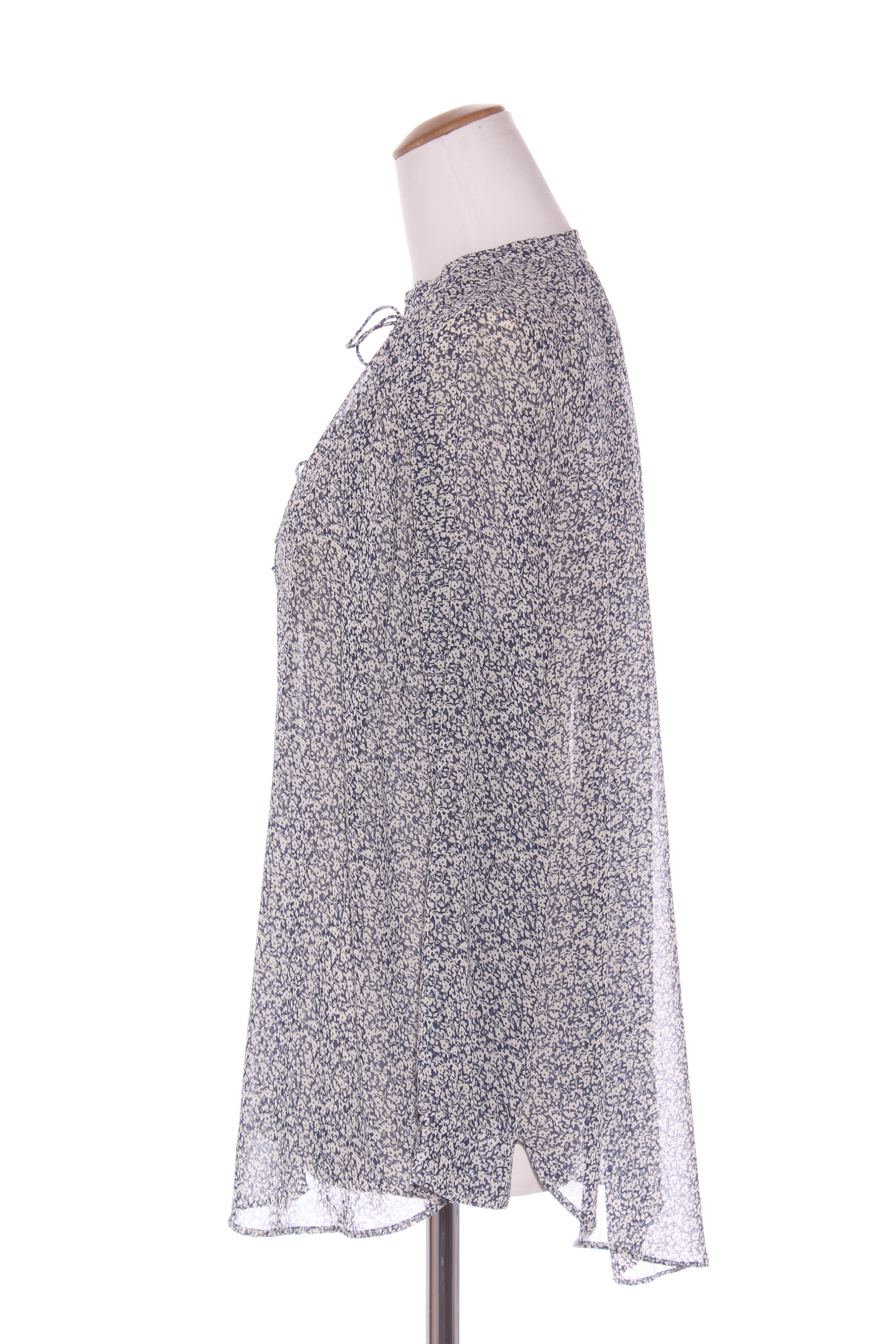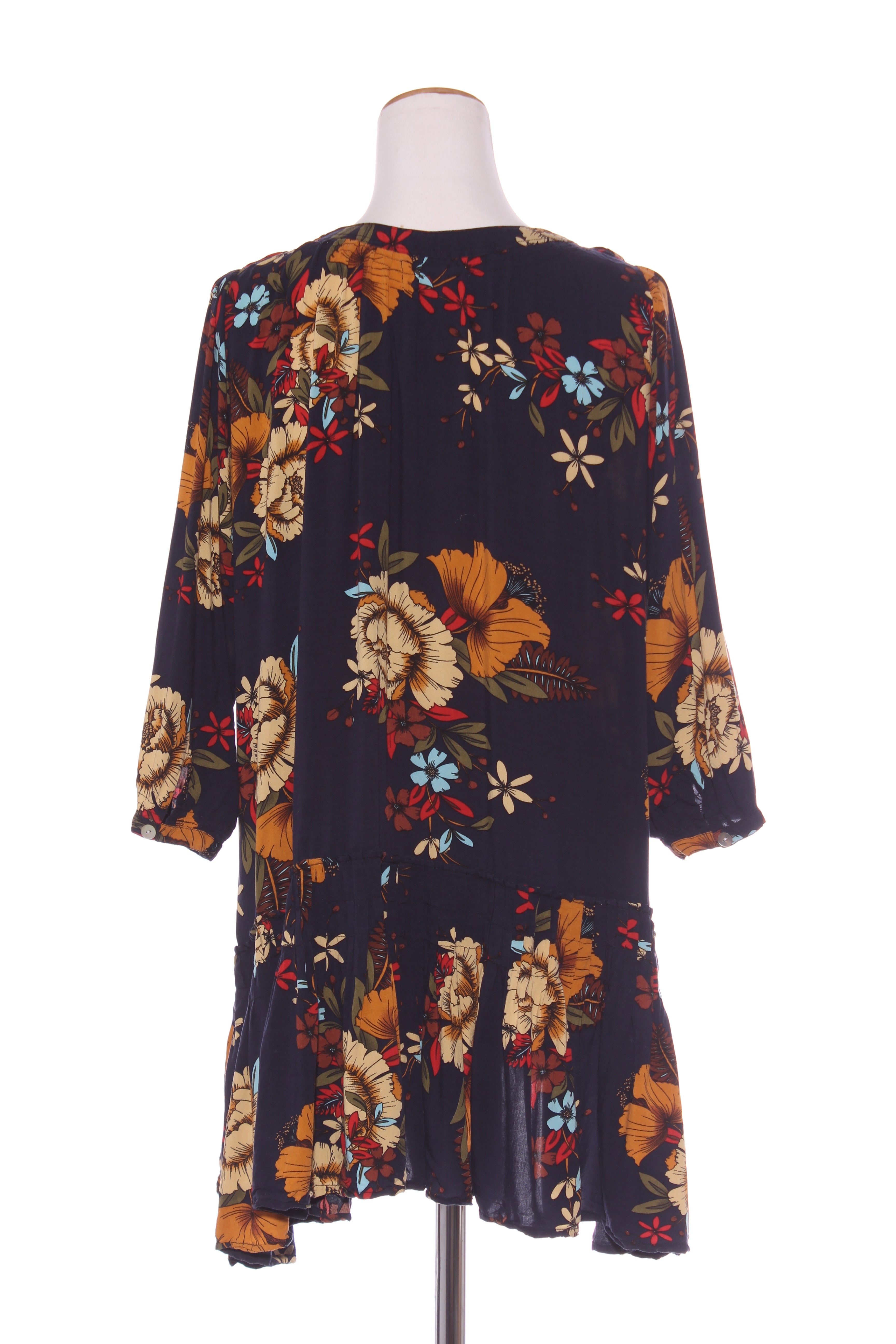 SIZE ON TAG: One sizeFITS LIKE: 8-14COLOUR: Navy blue, multiFABRIC: RayonCONDITION: Excellent prelovedMEASUREMENTS:BUST: 62cms WAIST: 69cms LENGTH: 77-84cmsNOTES: Button up front and sleeve ends. Side pockets.