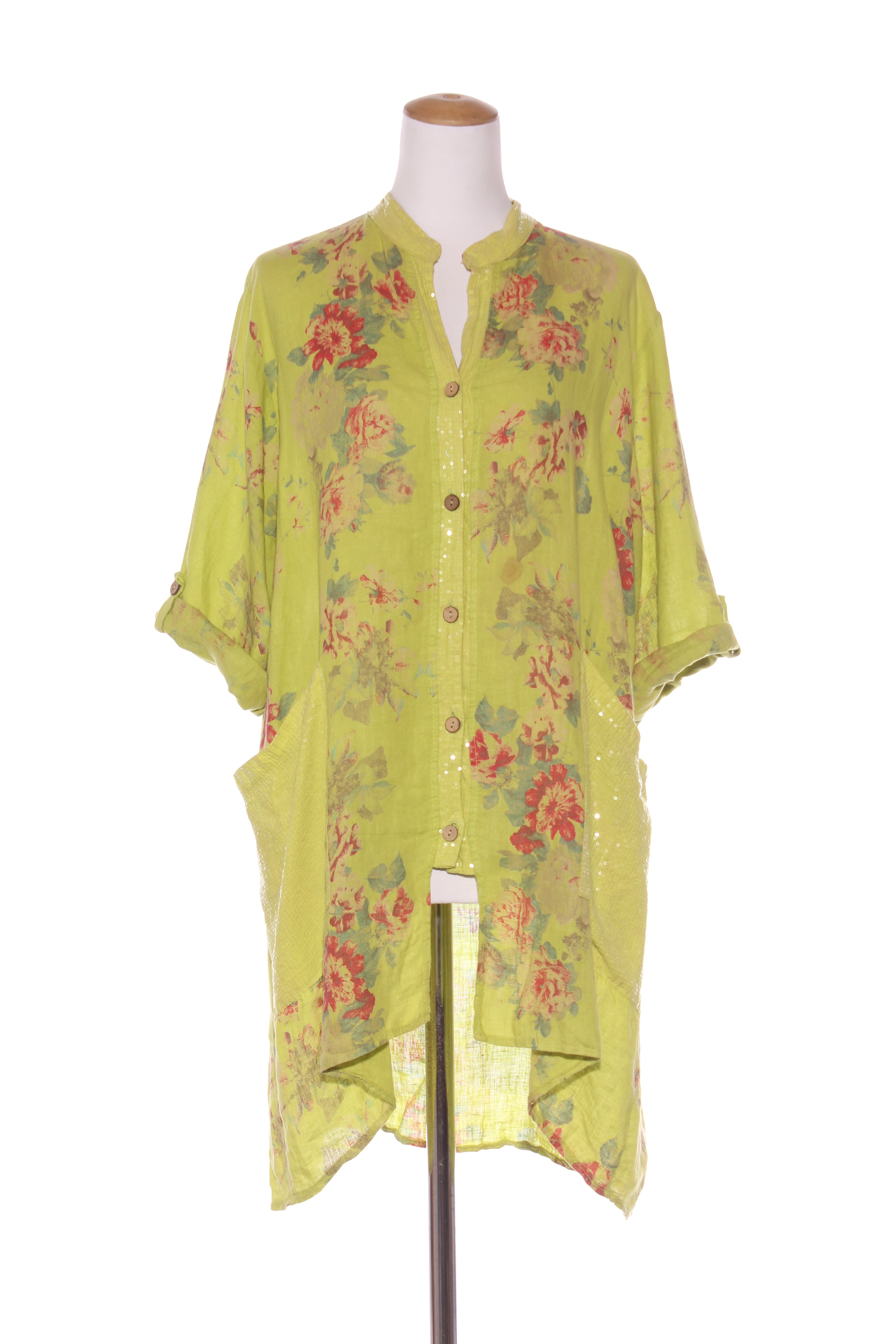 SIZE ON TAG: Not statedFITS LIKE: 14-16COLOUR: Green, multiFABRIC: LinenCONDITION: Excellent prelovedMEASUREMENTS:BUST: 64cms WAIST: 68cms LENGTH: 83-97cmsNOTES: Made in Italy. Button up front. Large front sequin...