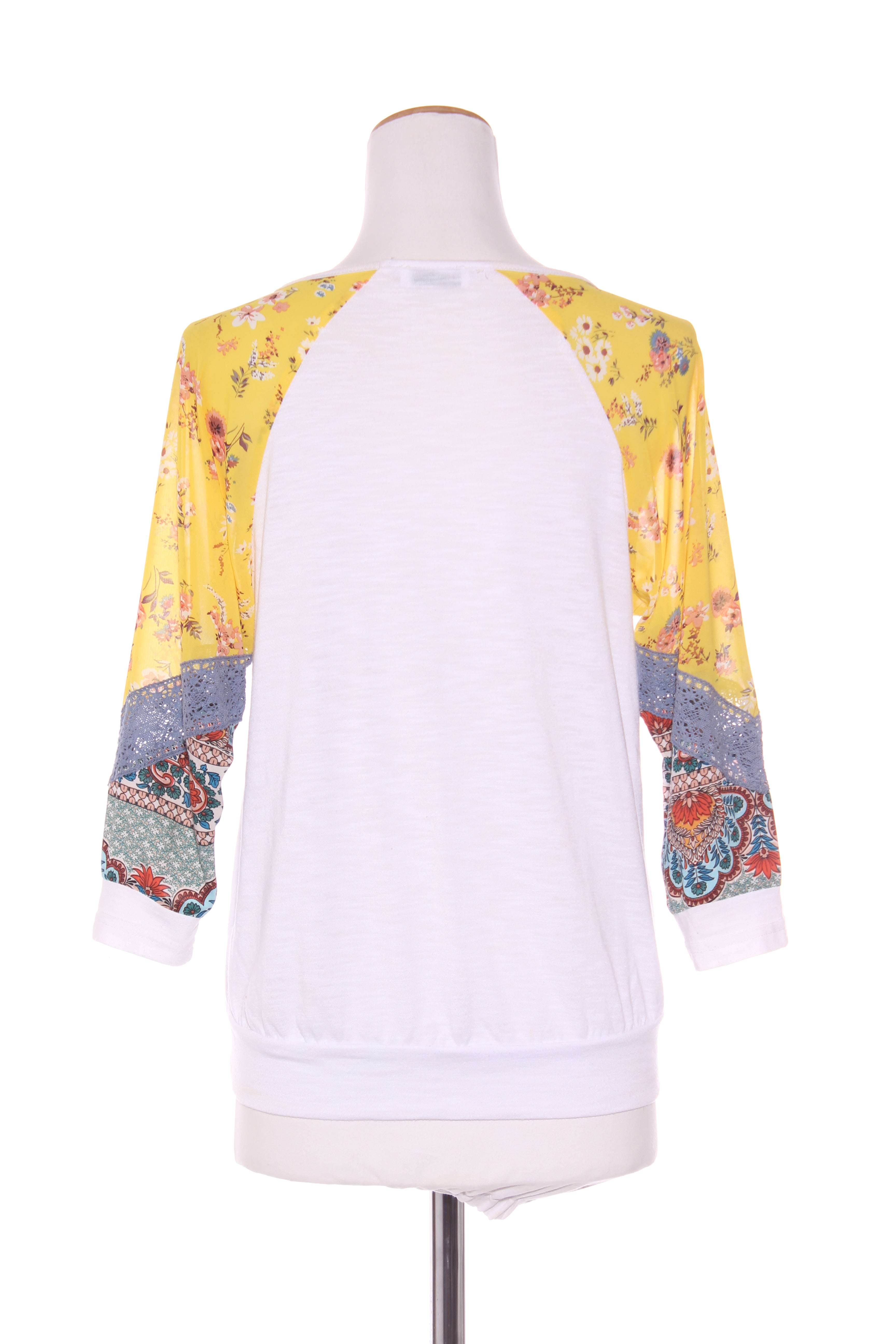 SIZE ON TAG: 8FITS LIKE: 8COLOUR: Multi, yellow, steel blue, whiteFABRIC: 65% polyester, 35% cotton, Contrast - polyesterCONDITION: Excellent prelovedMEASUREMENTS:BUST: 50cms WAIST: 49cms LENGTH: 62cmsNOTES: White...