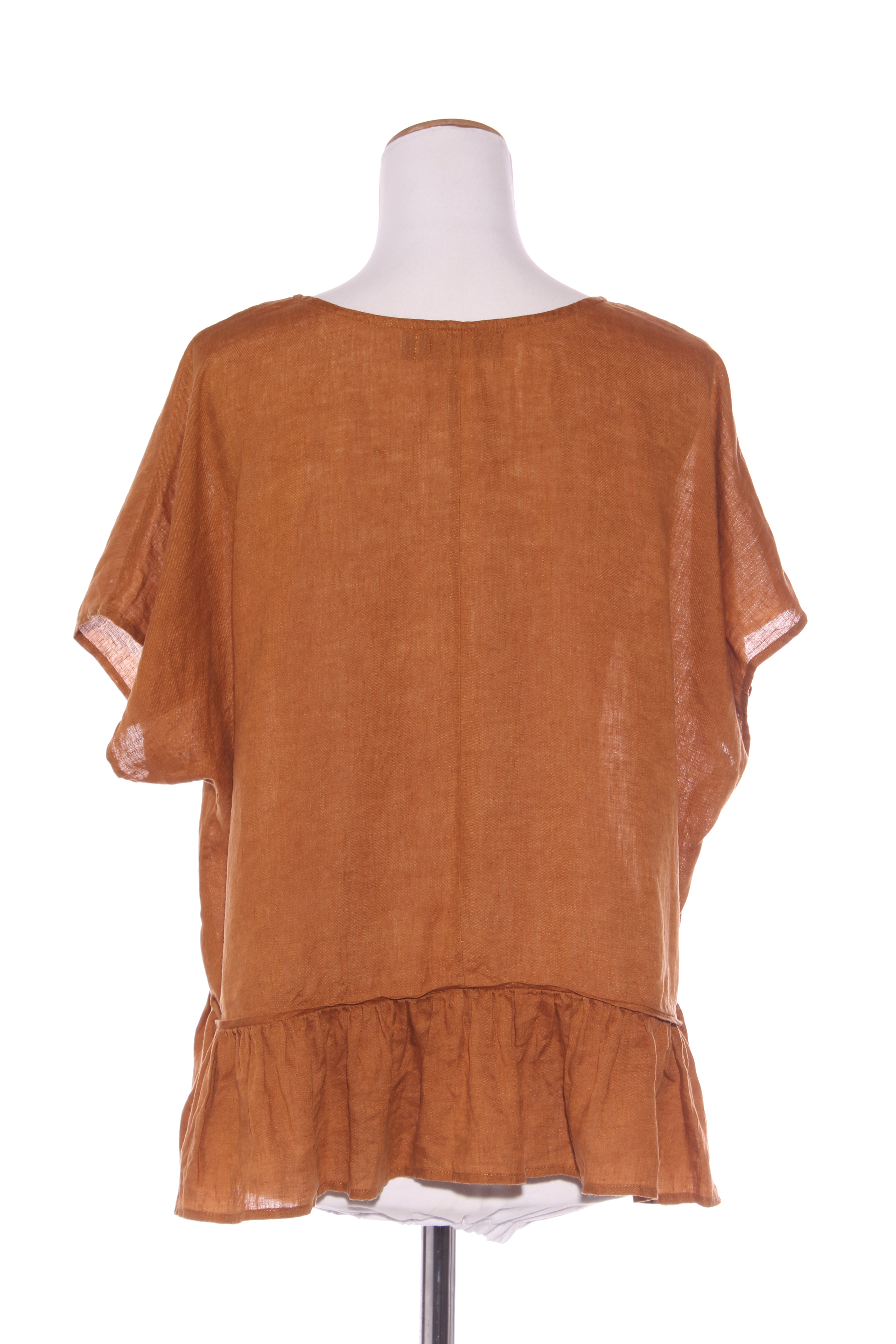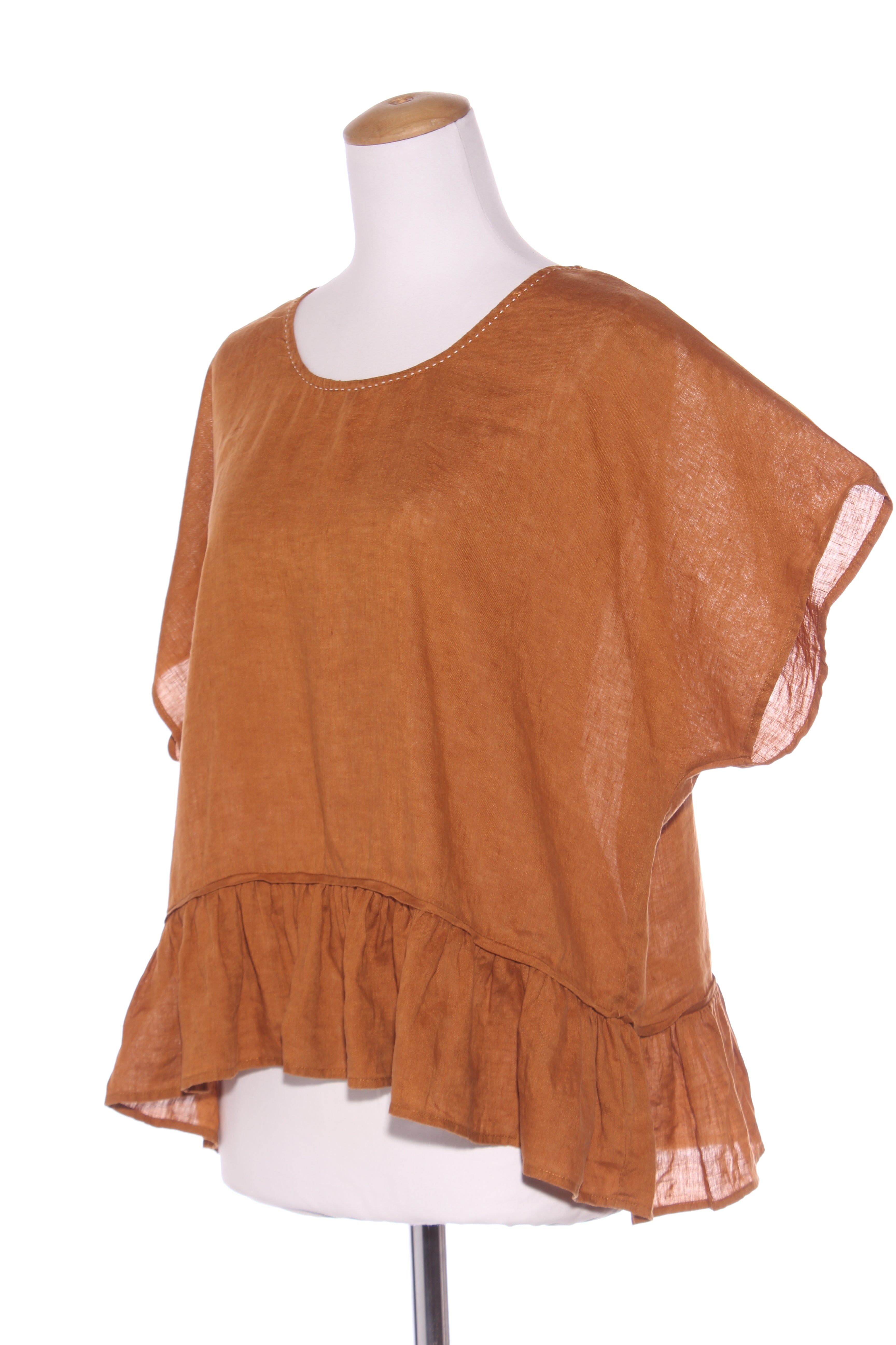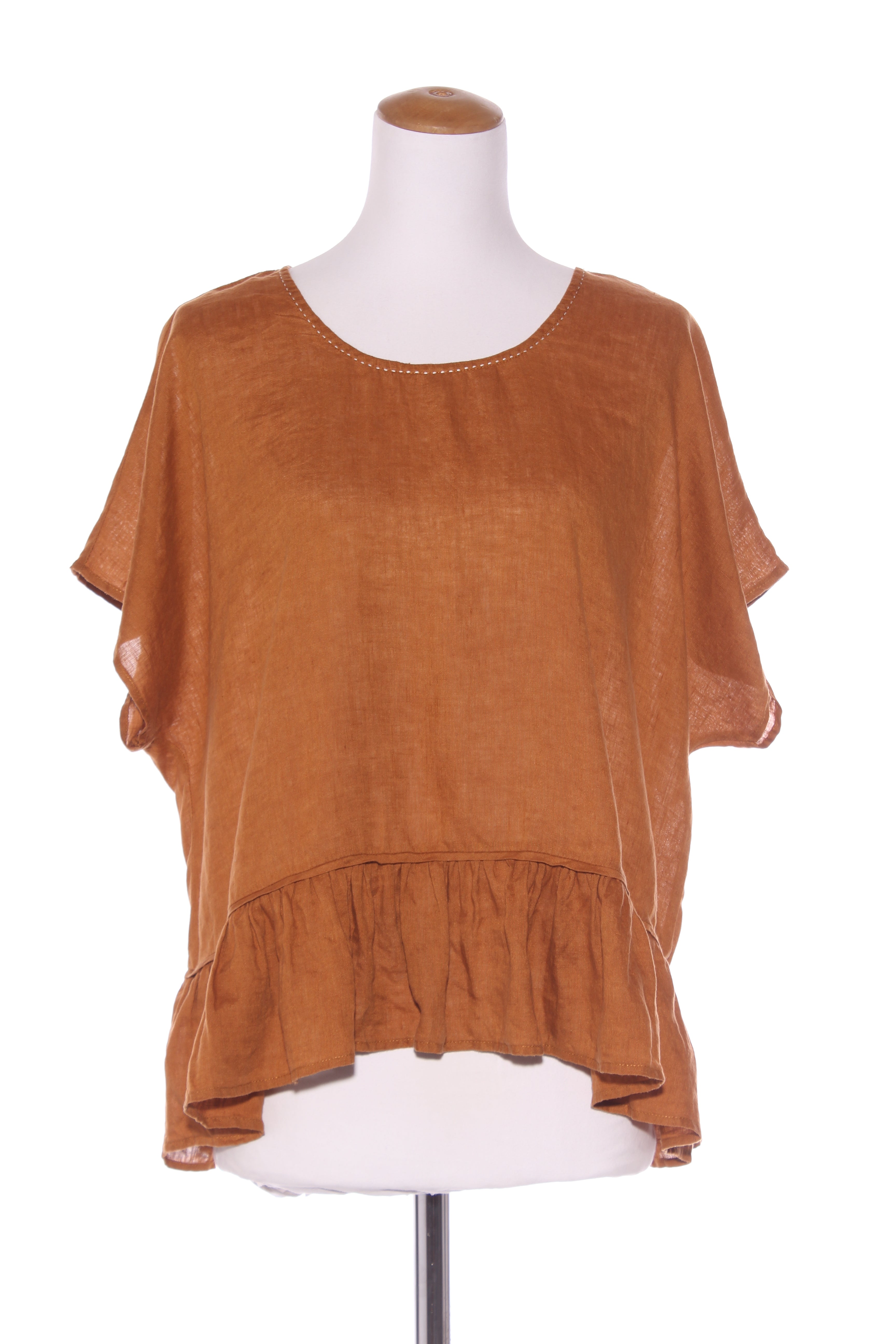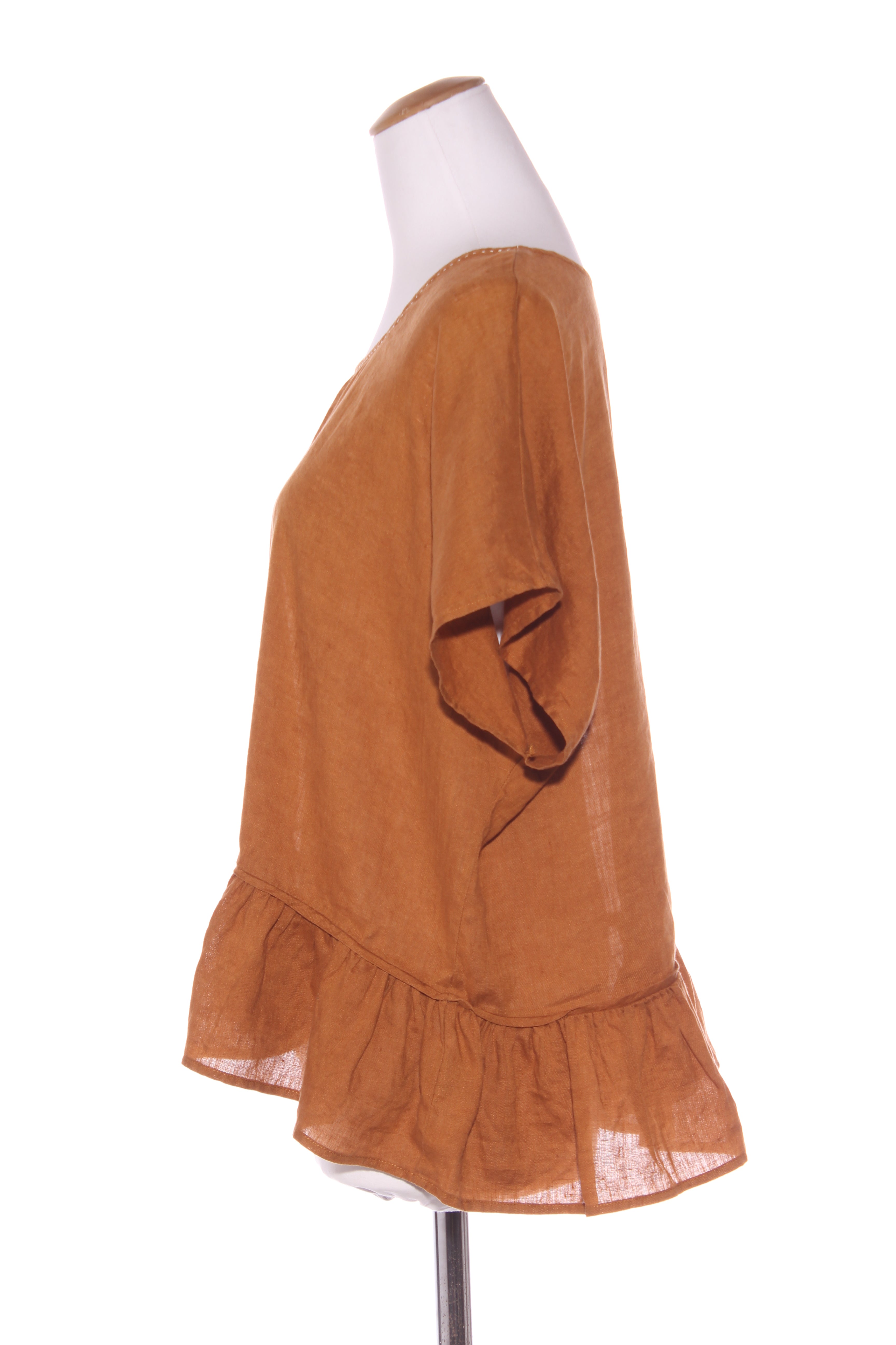 SIZE ON TAG: One sizeFITS LIKE: 8-16COLOUR: TobaccoFABRIC: LinenCONDITION: Excellent prelovedMEASUREMENTS:BUST: 65cms WAIST: 62cms LENGTH: 61-65cmsNOTES: Button up front and sleeve ends.