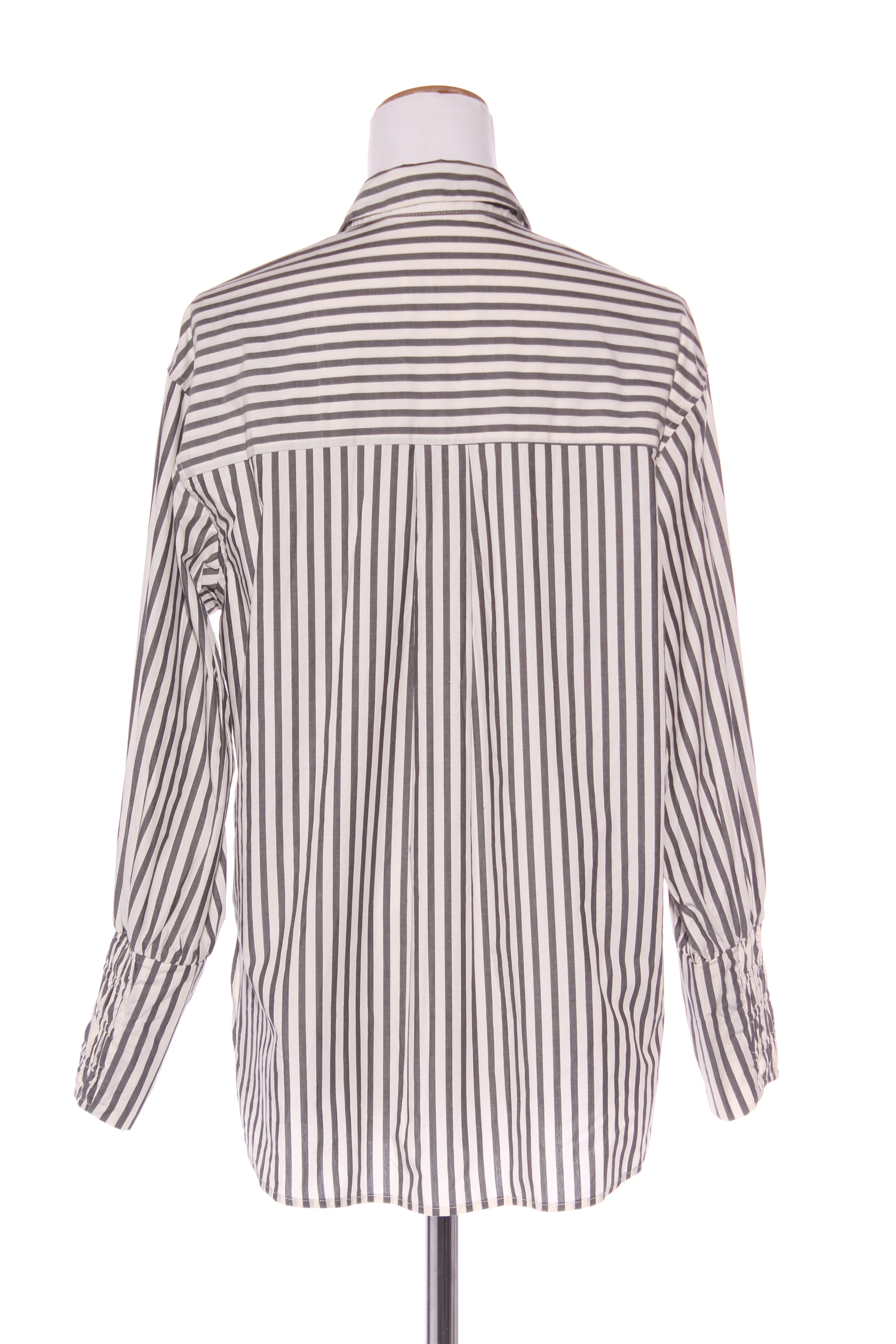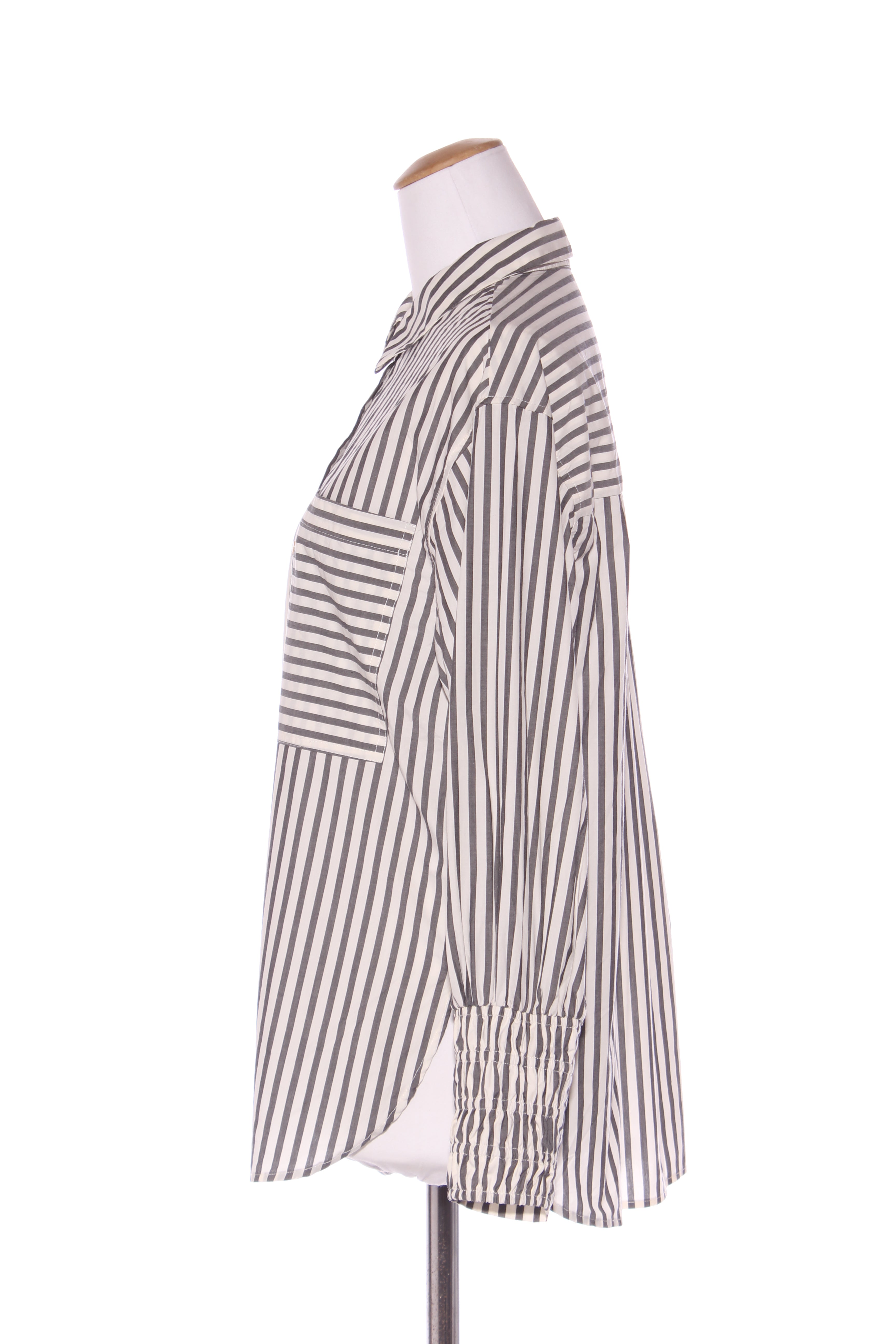 SIZE ON TAG: 10FITS LIKE: N/ACOLOUR: Grey, whiteFABRIC: CottonCONDITION: Excellent prelovedMEASUREMENTS:BUST: 55cms WAIST: 57cms LENGTH: 70-73cmsNOTES: Button up front. Elasticated sleeve ends.