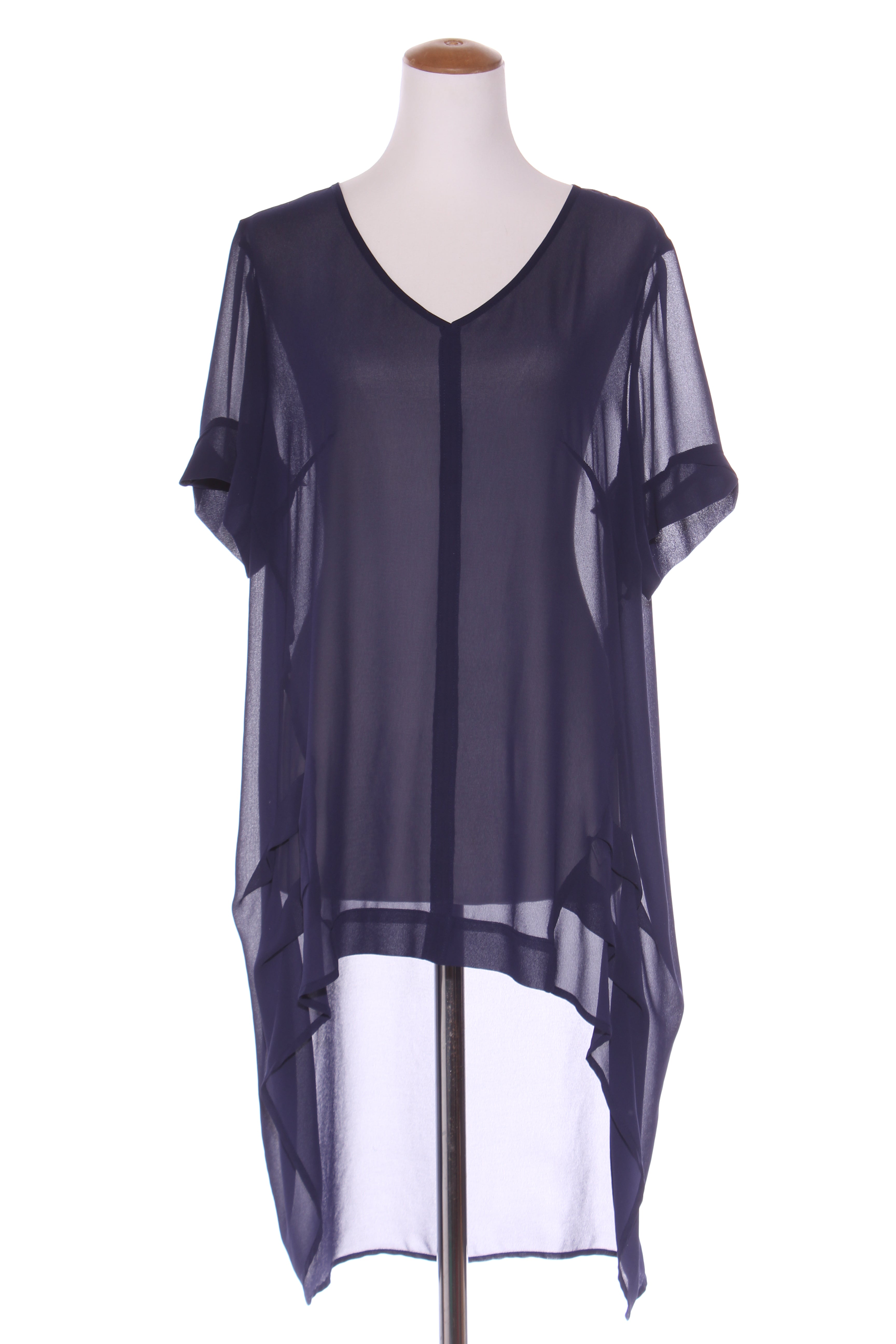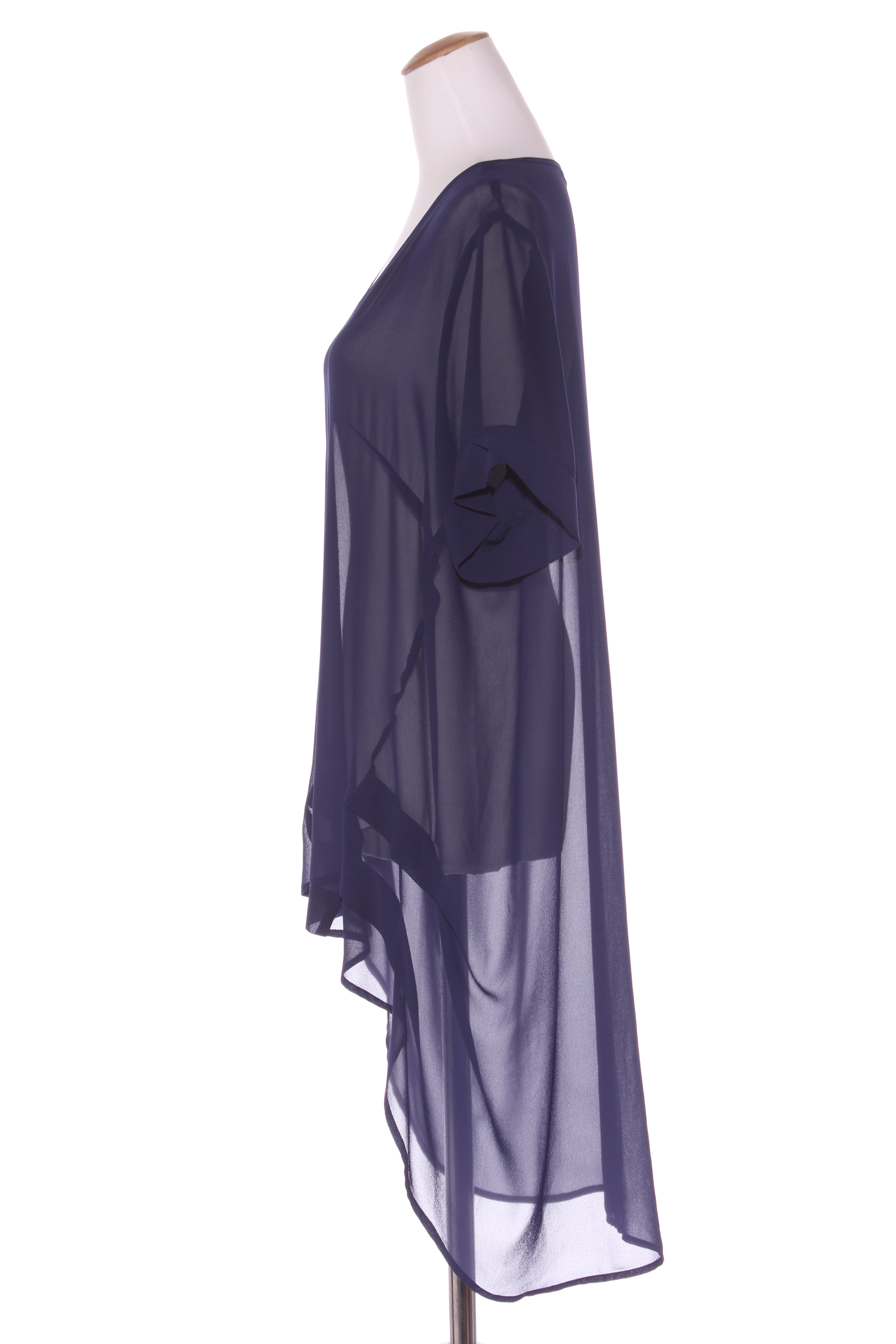 SIZE ON TAG: 18FITS LIKE: N/ACOLOUR: Navy blueFABRIC: PolyesterCONDITION: Excellent prelovedMEASUREMENTS:BUST: 60cms WAIST: 65cms LENGTH: 75-108cmsNOTES: Made in NZ. Scoop hemline. Slip required.