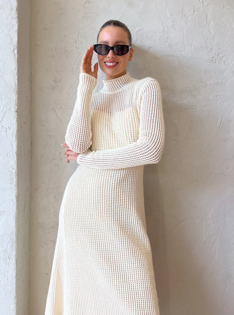 Crafted from a cream knit fabrication, this vacation-ready maxi boasts a crochet-like texture, a slim fit through the top which flares out into skirt, with long sleeves and a mock neckline. A cotton slip is also included for modesty.