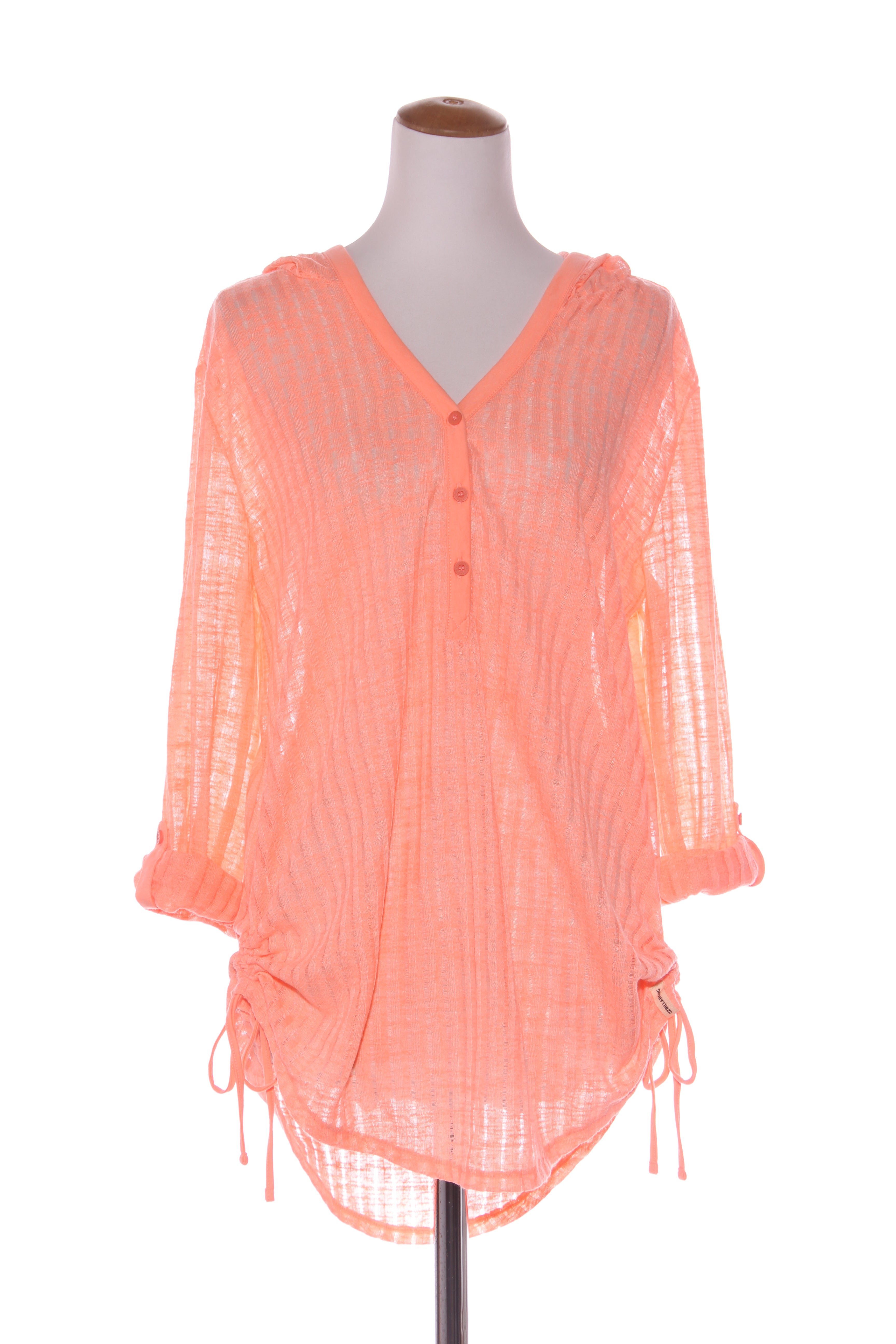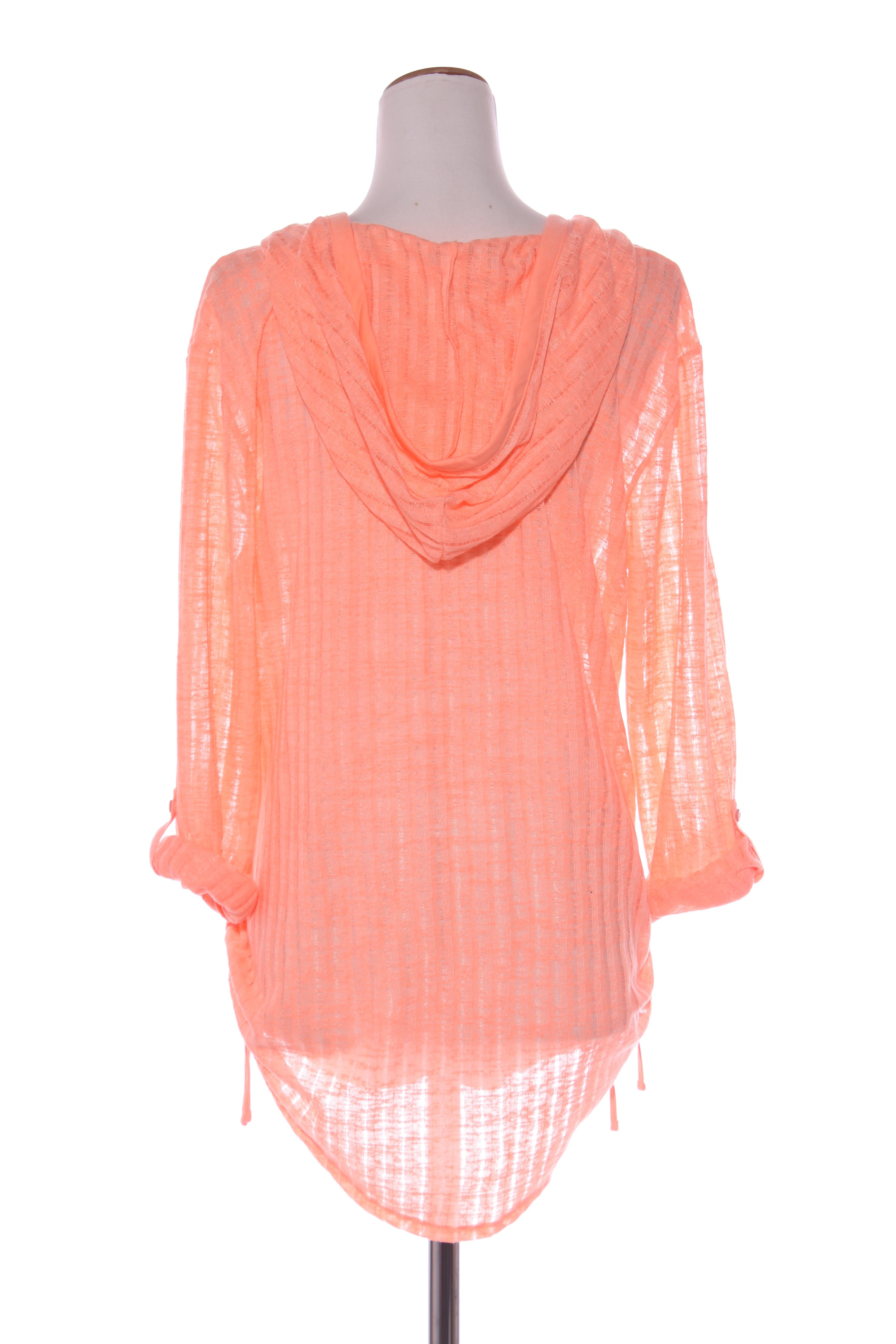 NOTES: Great coverup for the beach or poolside in a gorgeous neon orange. Button up front. Adjustable sleeve length buttons in place. Fabric has stretch. Gather sides with dual drawstring. Slip required.