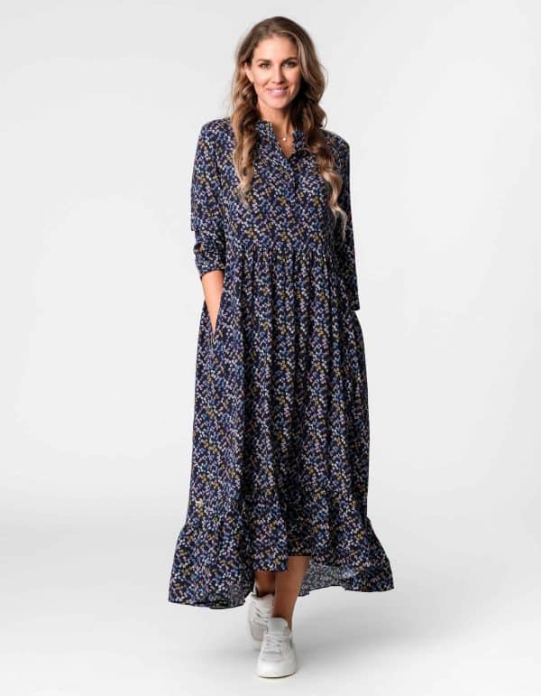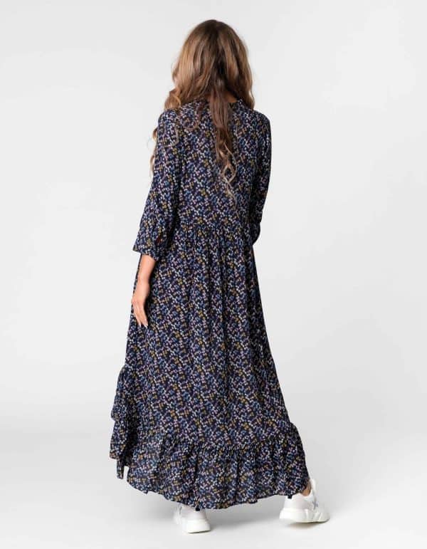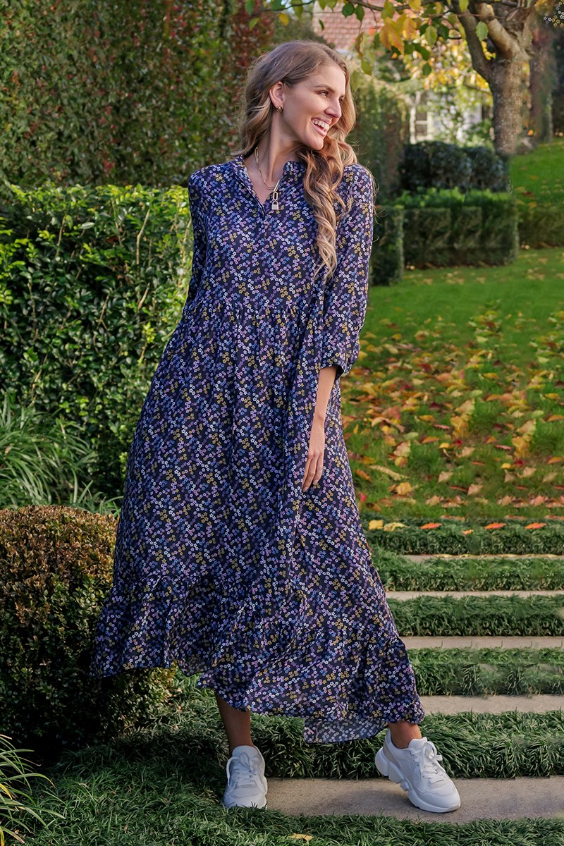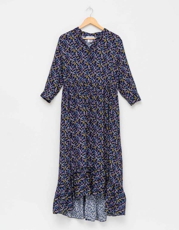 SIZE ON TAG: 14FITS LIKE: N/ACOLOUR: Lilac, navy blue, multiFABRIC: 55% viscose, 45% rayonCONDITION: Excellent prelovedMEASUREMENTS:BUST: 54cms WAIST: 48cms LENGTH: 123-134cmsNOTES: Relaxed fit maxi dress with hi-lo tiered...