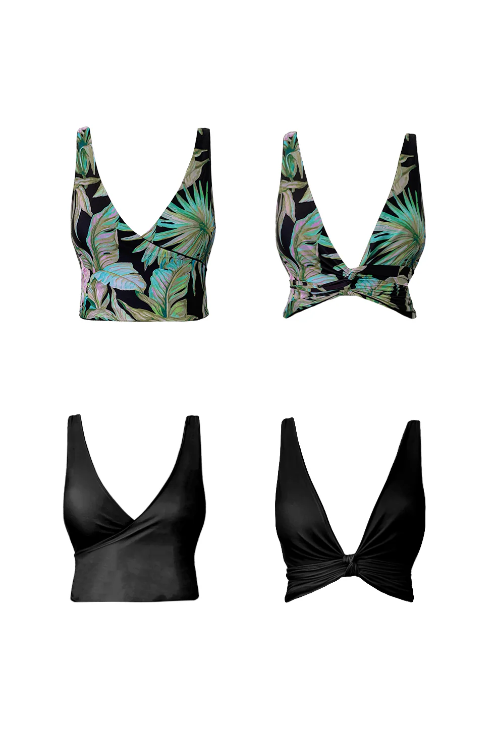 SIZE: No size on garments........Size 10 top, Size 12 bottomsFITS LIKE: 10-12COLOUR: Green, black, multiFABRIC: Italian recycled nylon and polyesterCONDITION: Like new NOTES: Slip into the timeless Martinique Bikini Top...