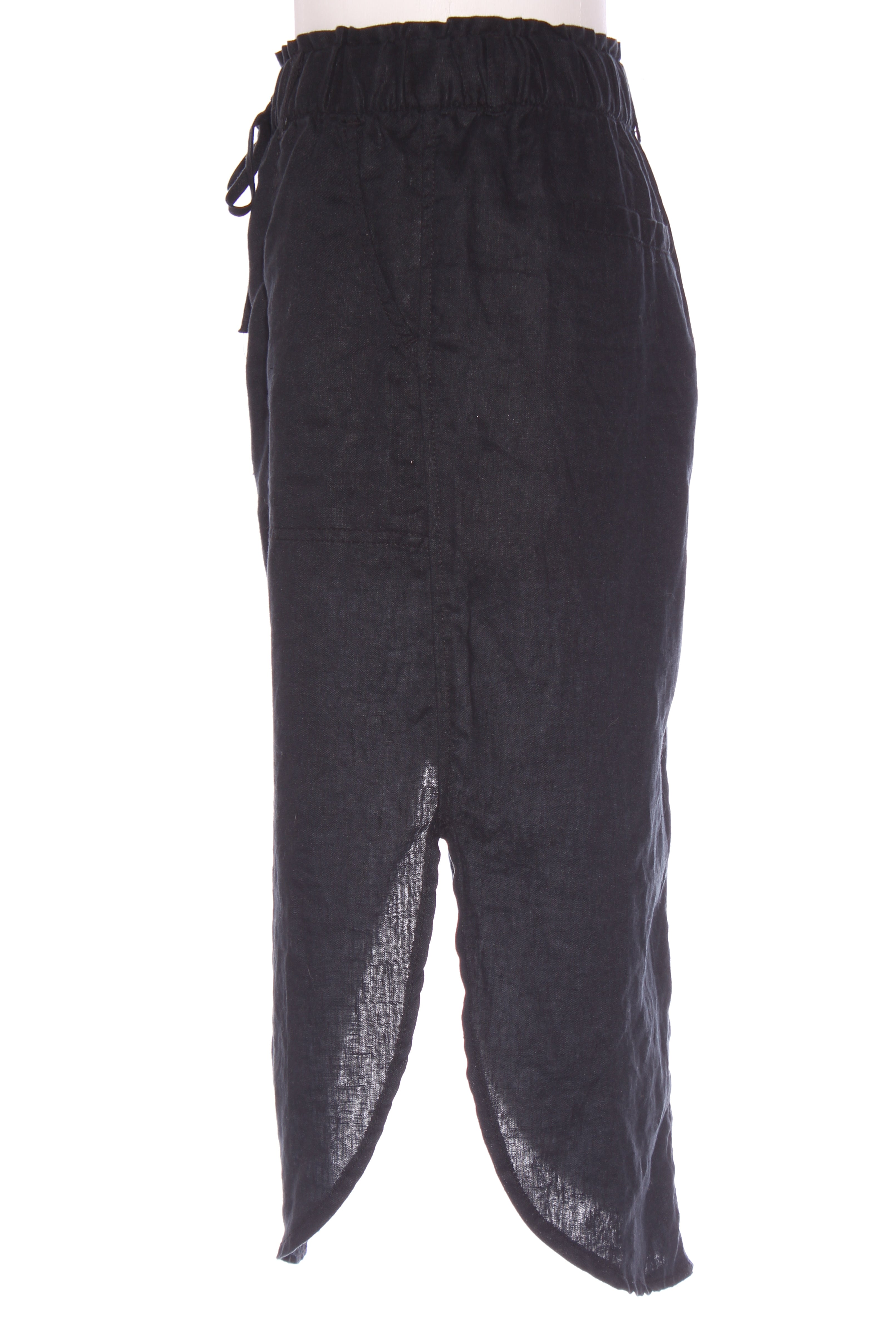 SIZE ON TAG: 6FITS LIKE: 6-8COLOUR: BlackFABRIC: LinenCONDITION: Excellent prelovedMEASUREMENTS:WAIST: 33cms HIPS: 48cms LENGTH: 67-71cmsNOTES: Elasticated waist with drawstring with belt loops. Front pockets.