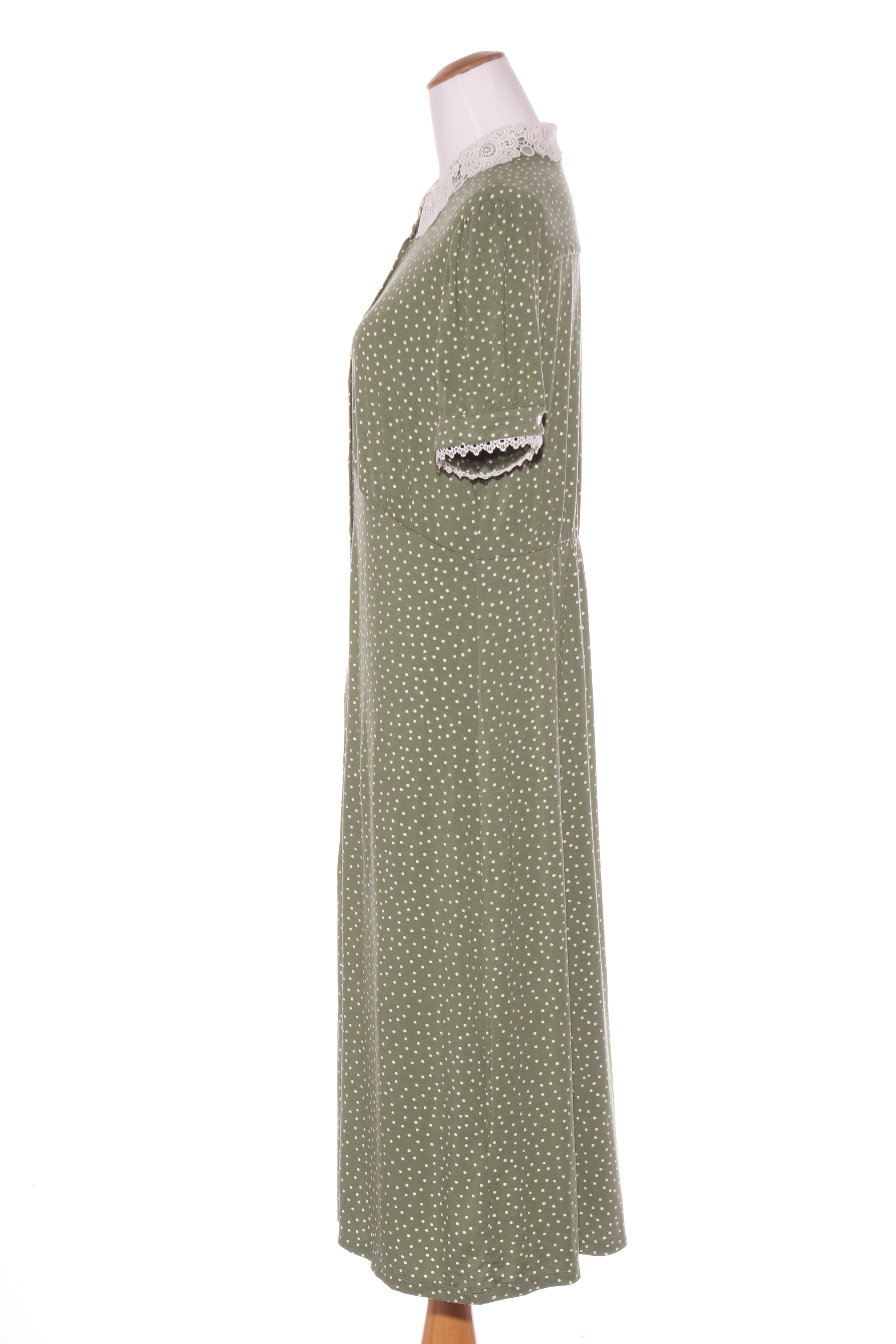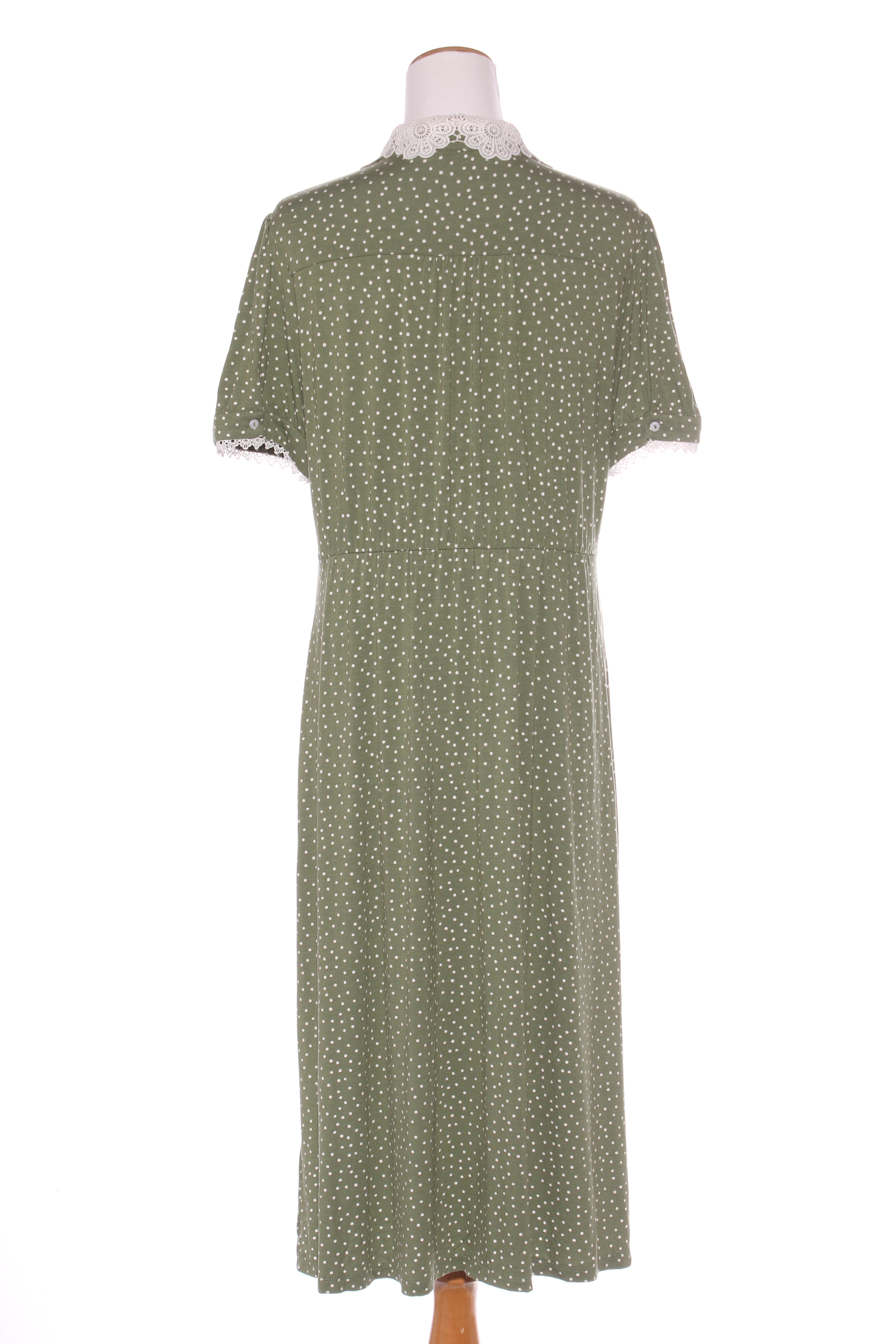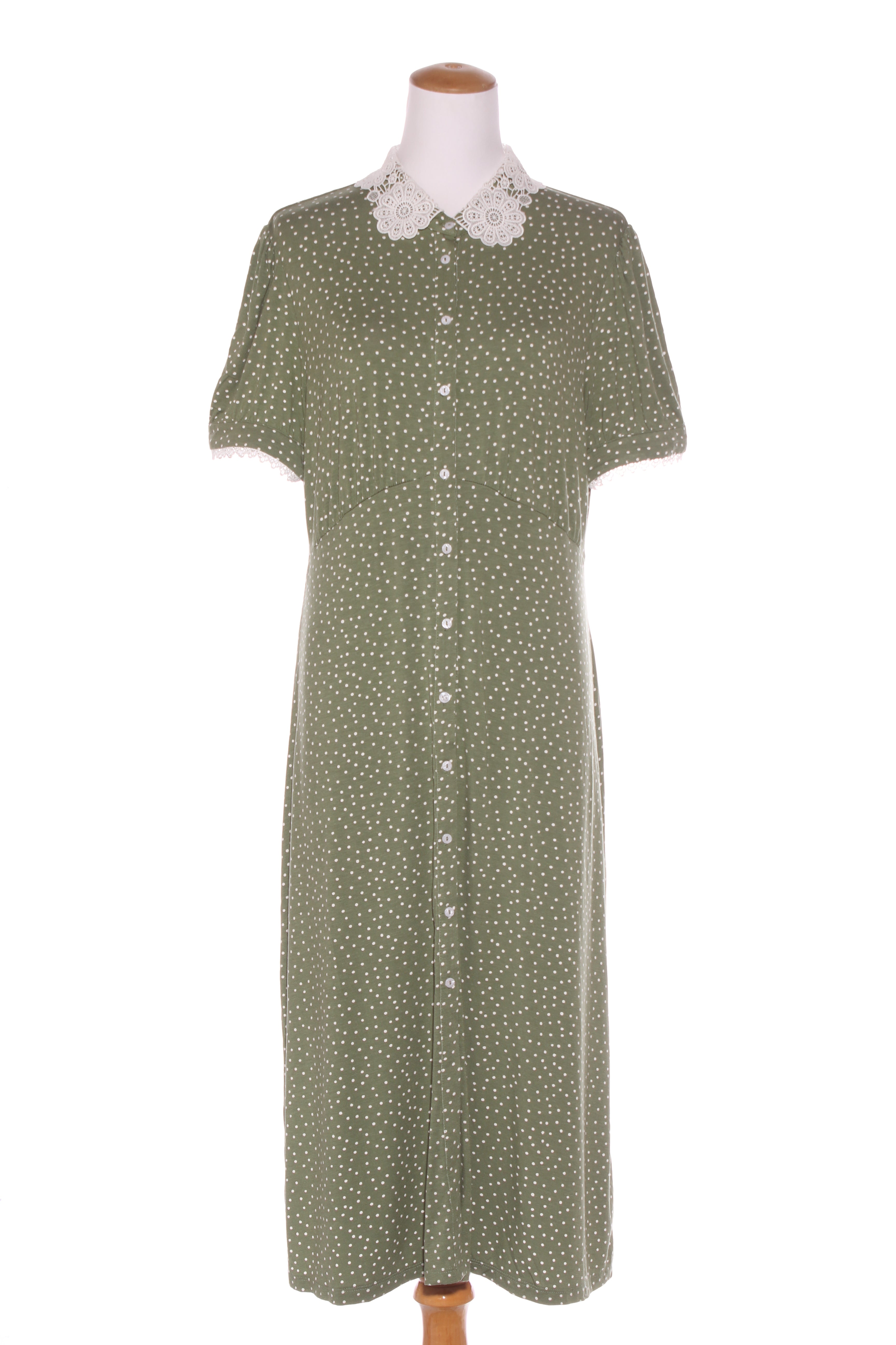 NOTES: Vintage perfection. Is it just us, or does it feel like the 1940s in here? Falling to a midi-length, this dress is cut in an elegant tea silhouette with a button fastening through the front and spot print. Not enough detailing? This dress is finished with beautifully intricate lace trims to the sleeves and collar. Fabric has stretch.