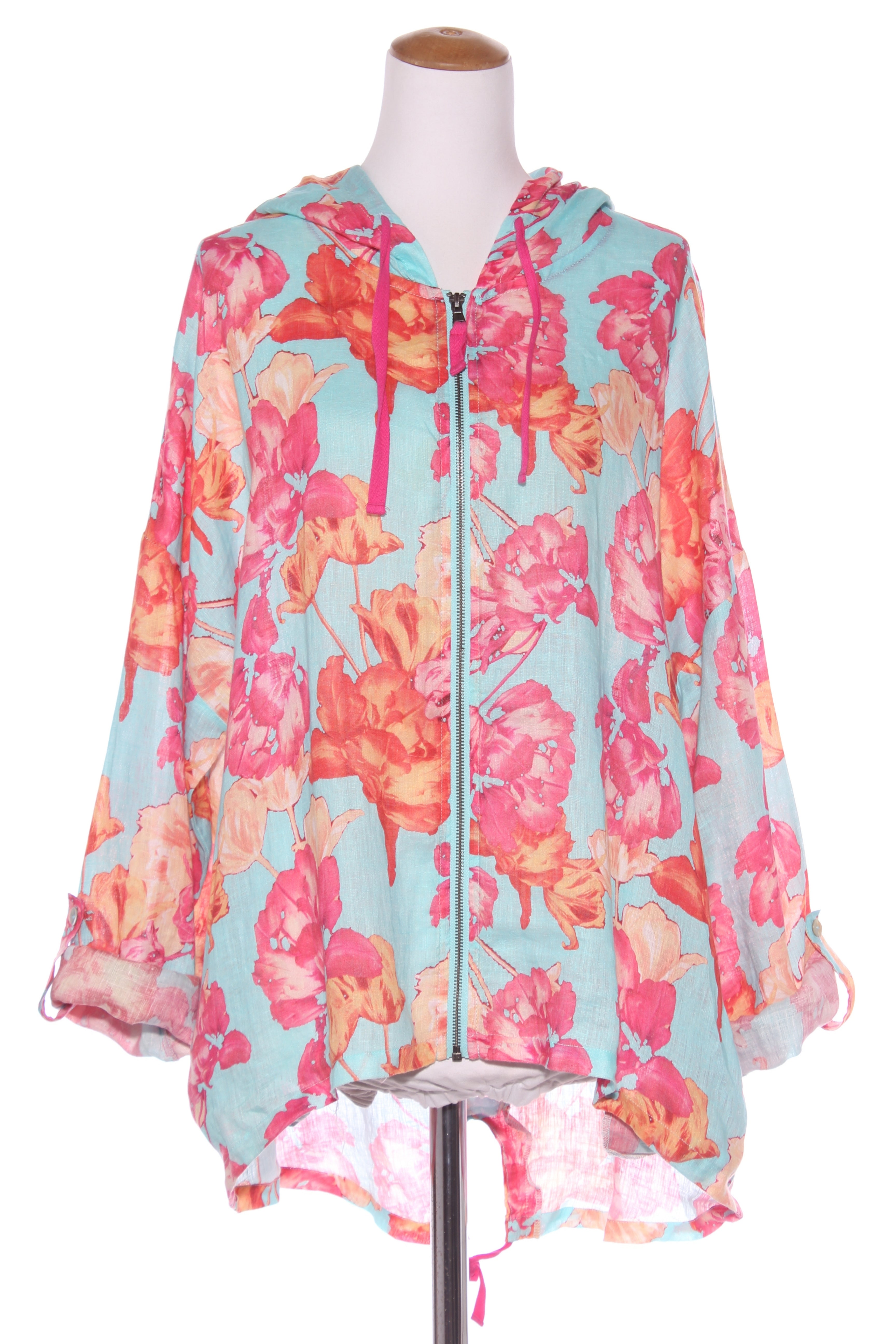 NOTES: Zip up front. Drawstring through hood. Adjustable sleeve length buttons in place. Side pockets.