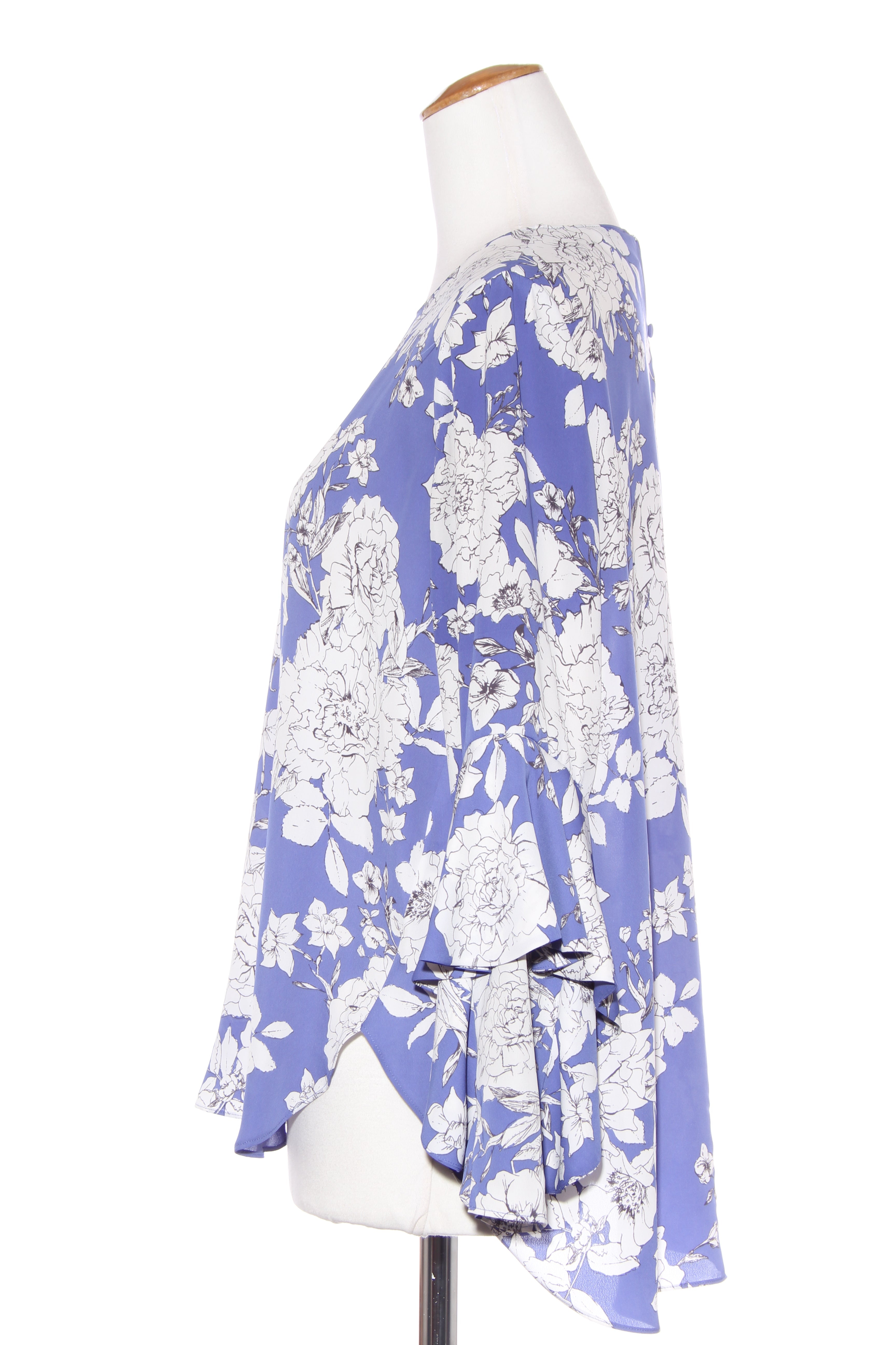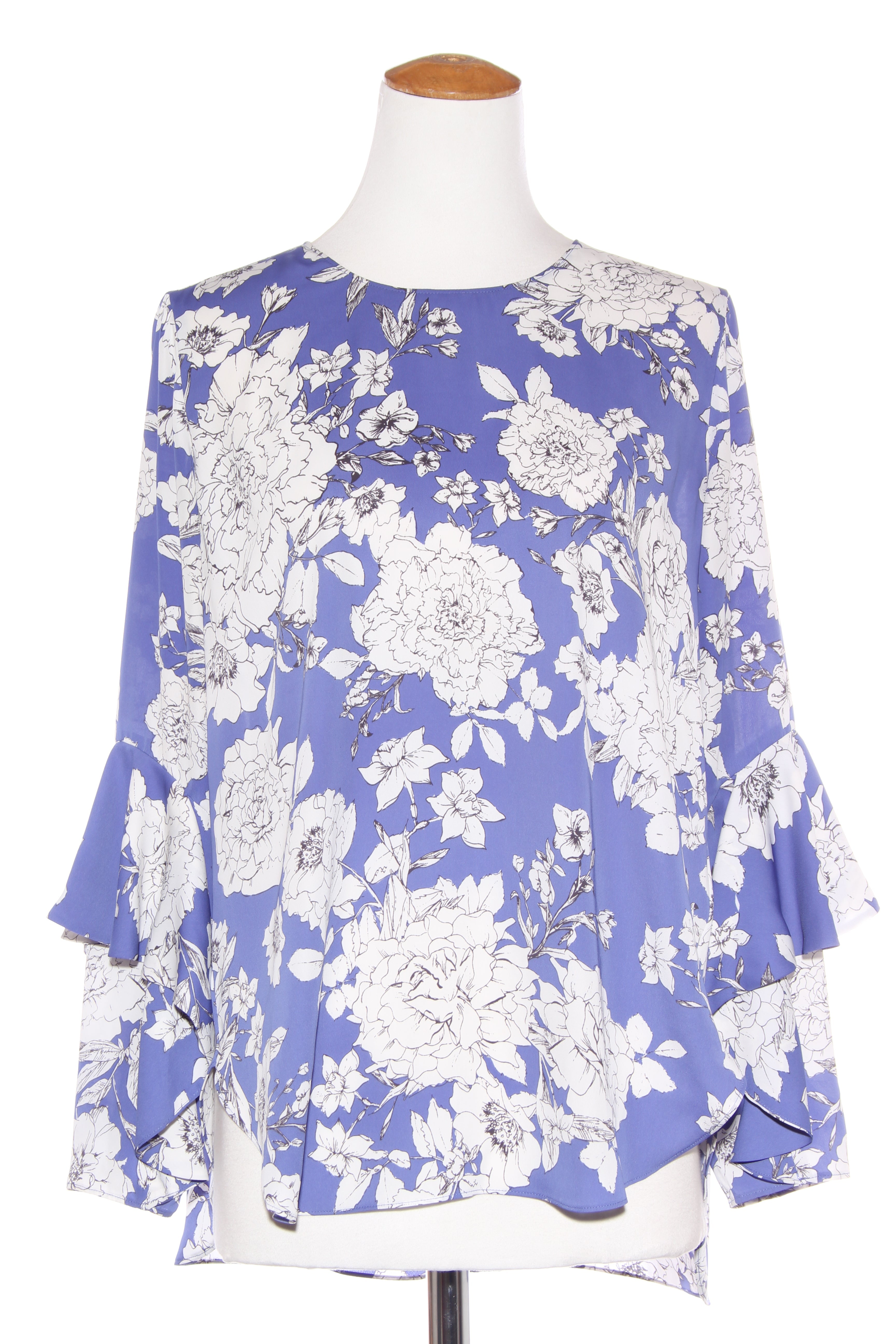 SIZE ON TAG: 12FITS LIKE: N/ACOLOUR: Blueish purple, white, blackFABRIC: PolyesterCONDITION: Excellent preloved, MEASUREMENTS:BUST: 58cms WAIST: 62cms LENGTH: 68-75cmsNOTES: Button up nape of neck. Ruffled sleeves.