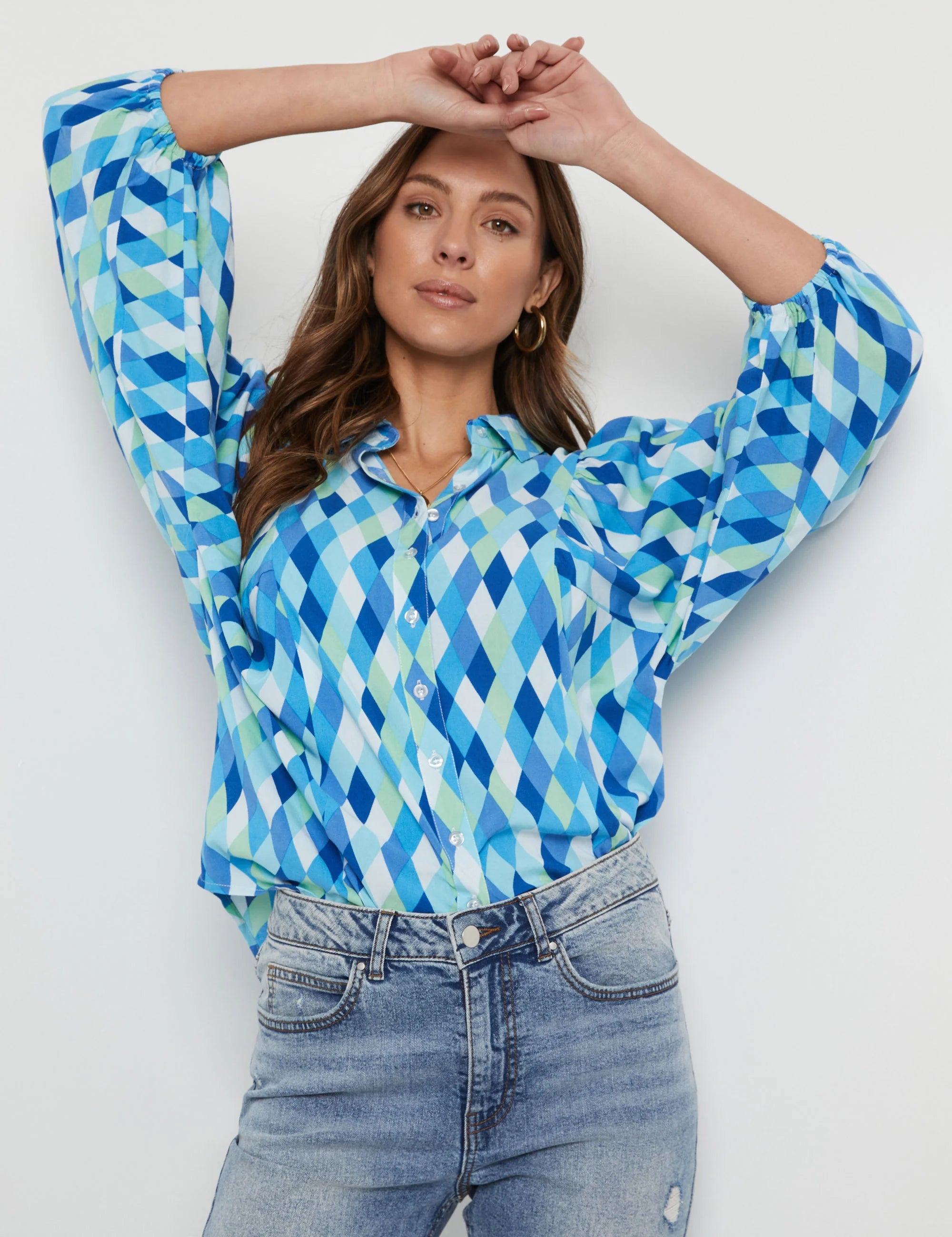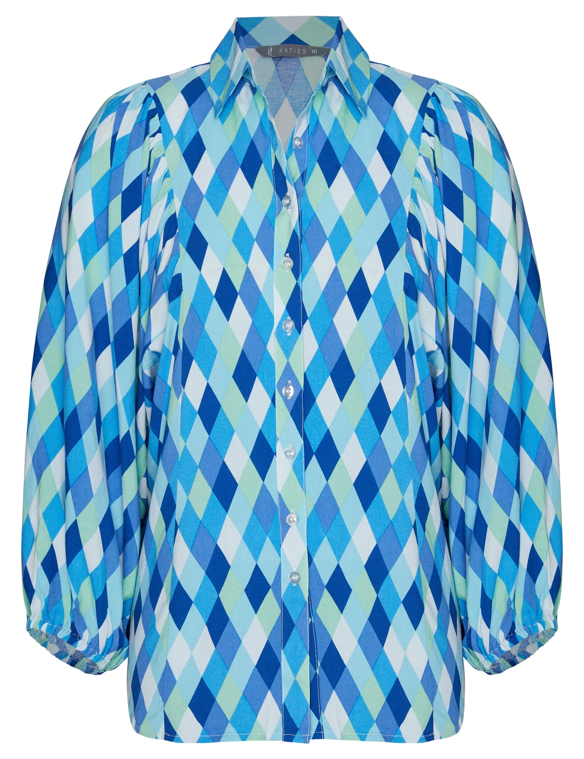 SIZE ON TAG: 16FITS LIKE: N/ACOLOUR: Blue, green, whiteFABRIC: ViscoseCONDITION: Brand new with tagMEASUREMENTS:BUST: 62cms WAIST: 61cms LENGTH: 73cmsNOTES: Upgrade your wardrobe with Katies puff sleeve...