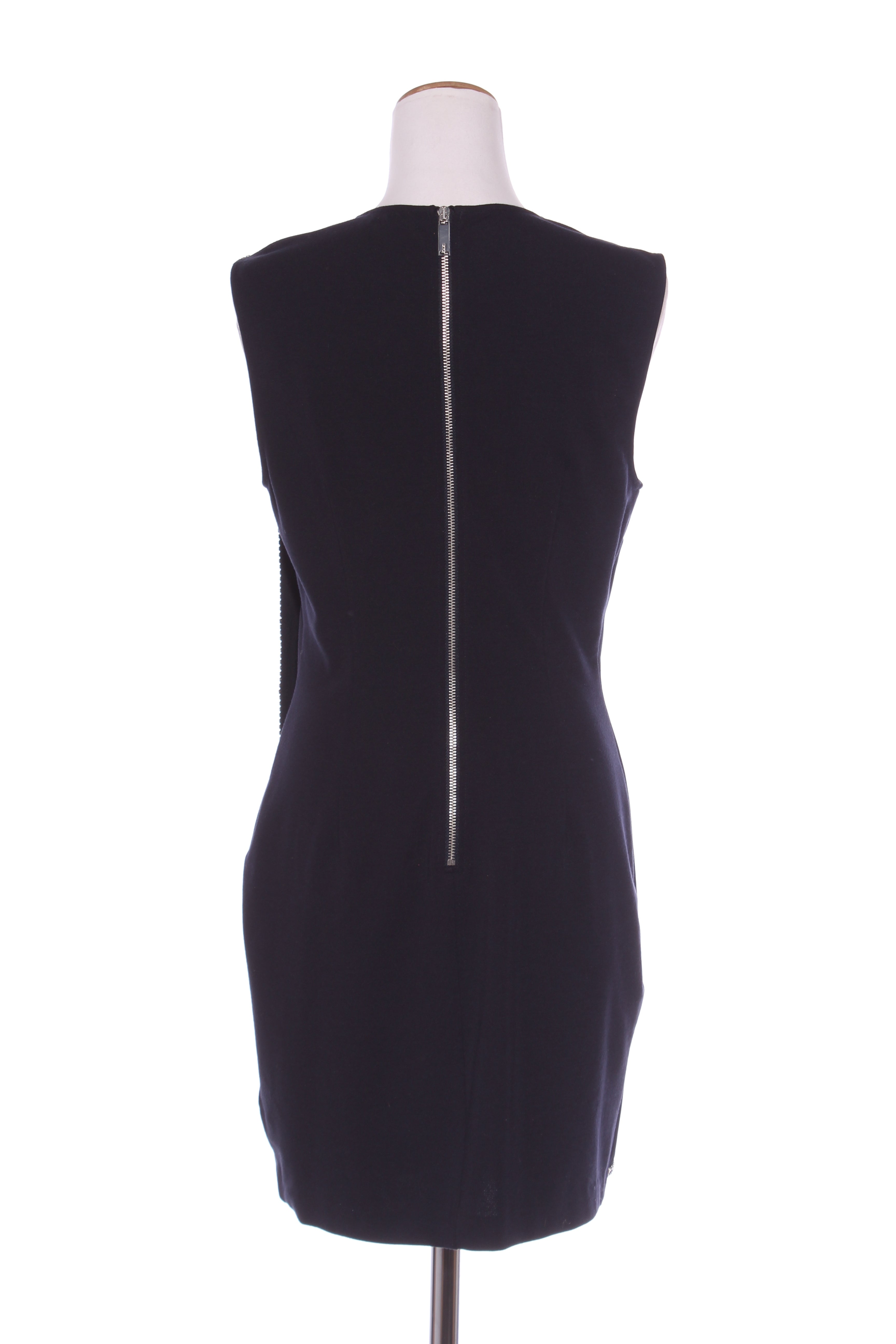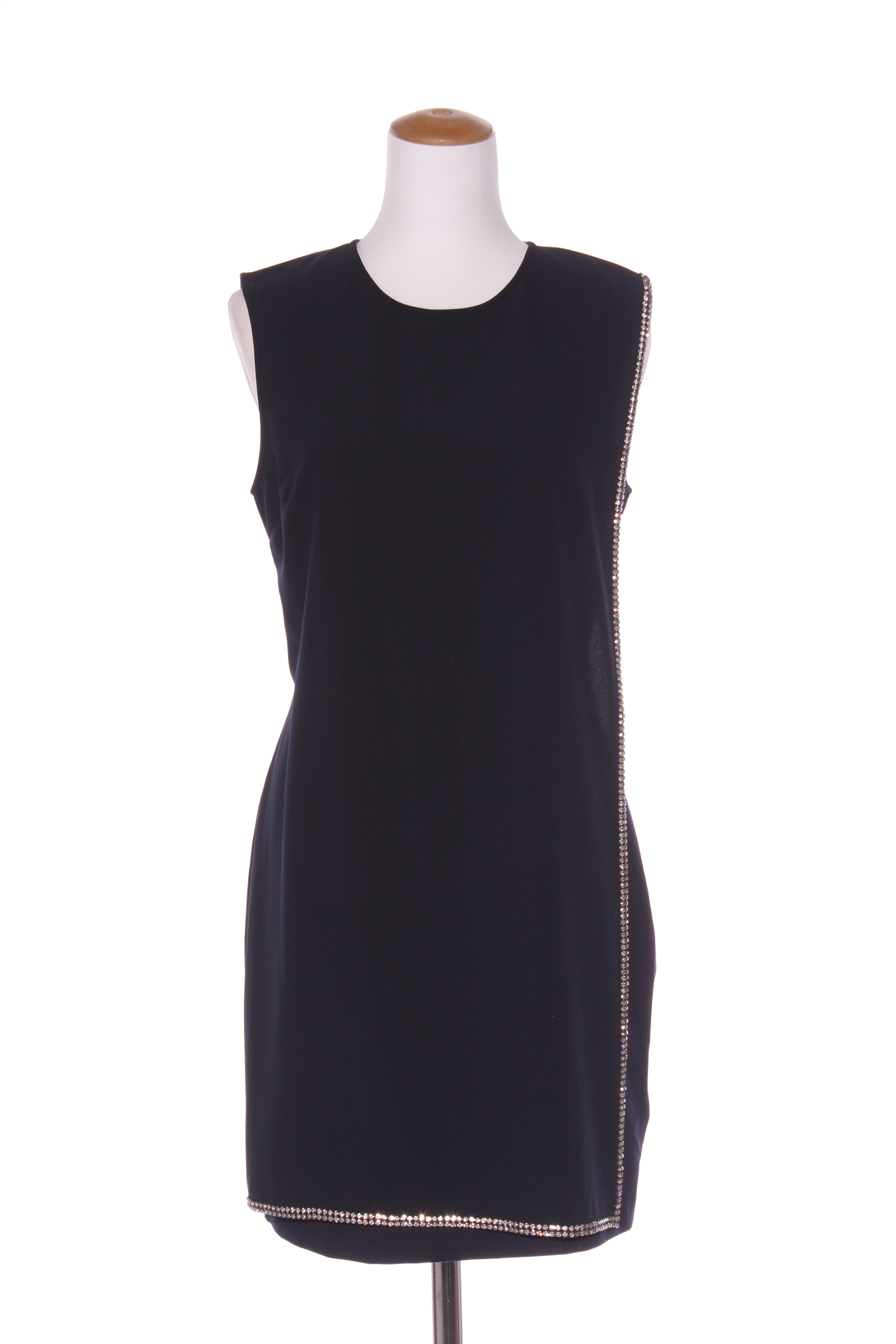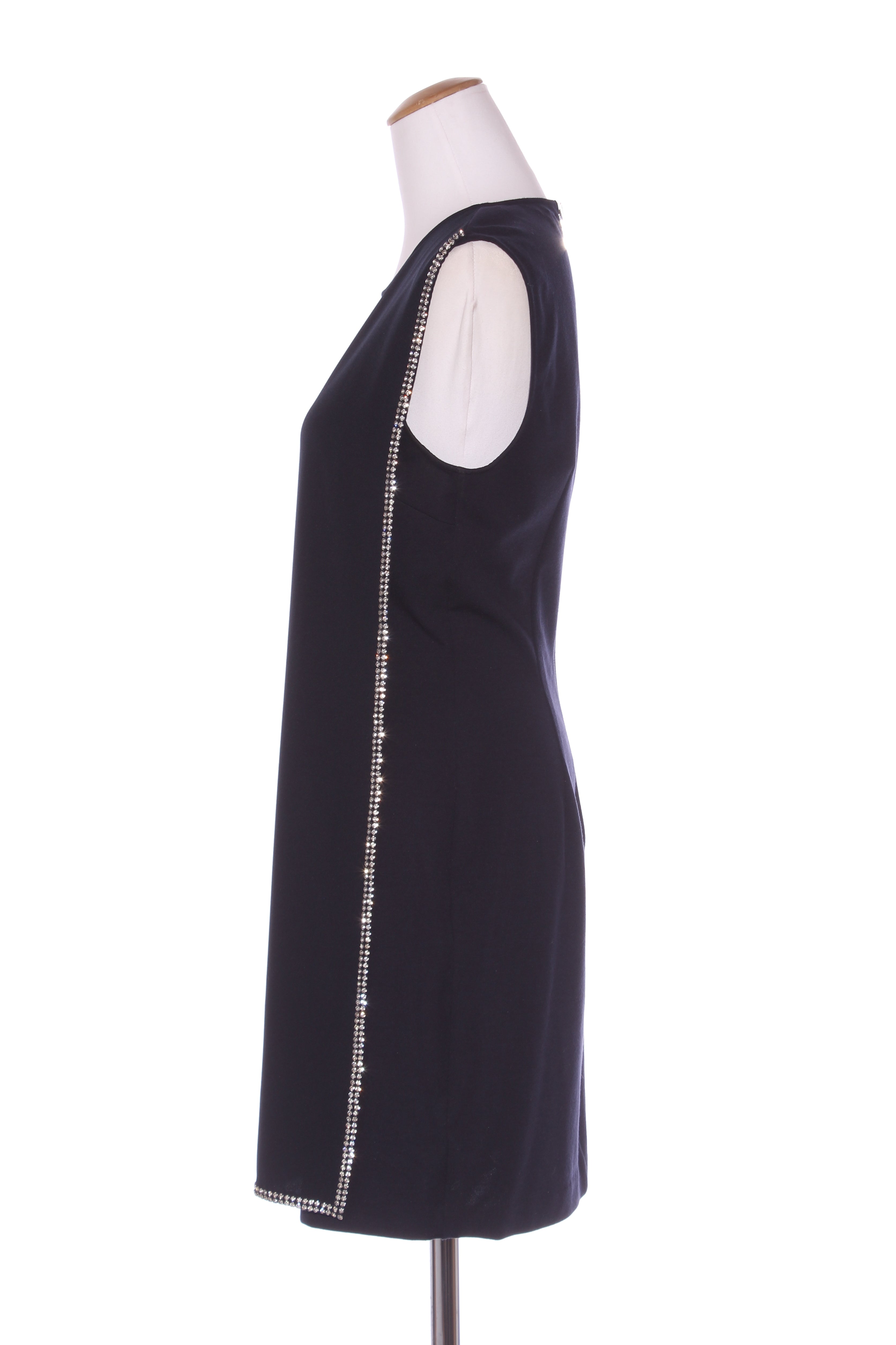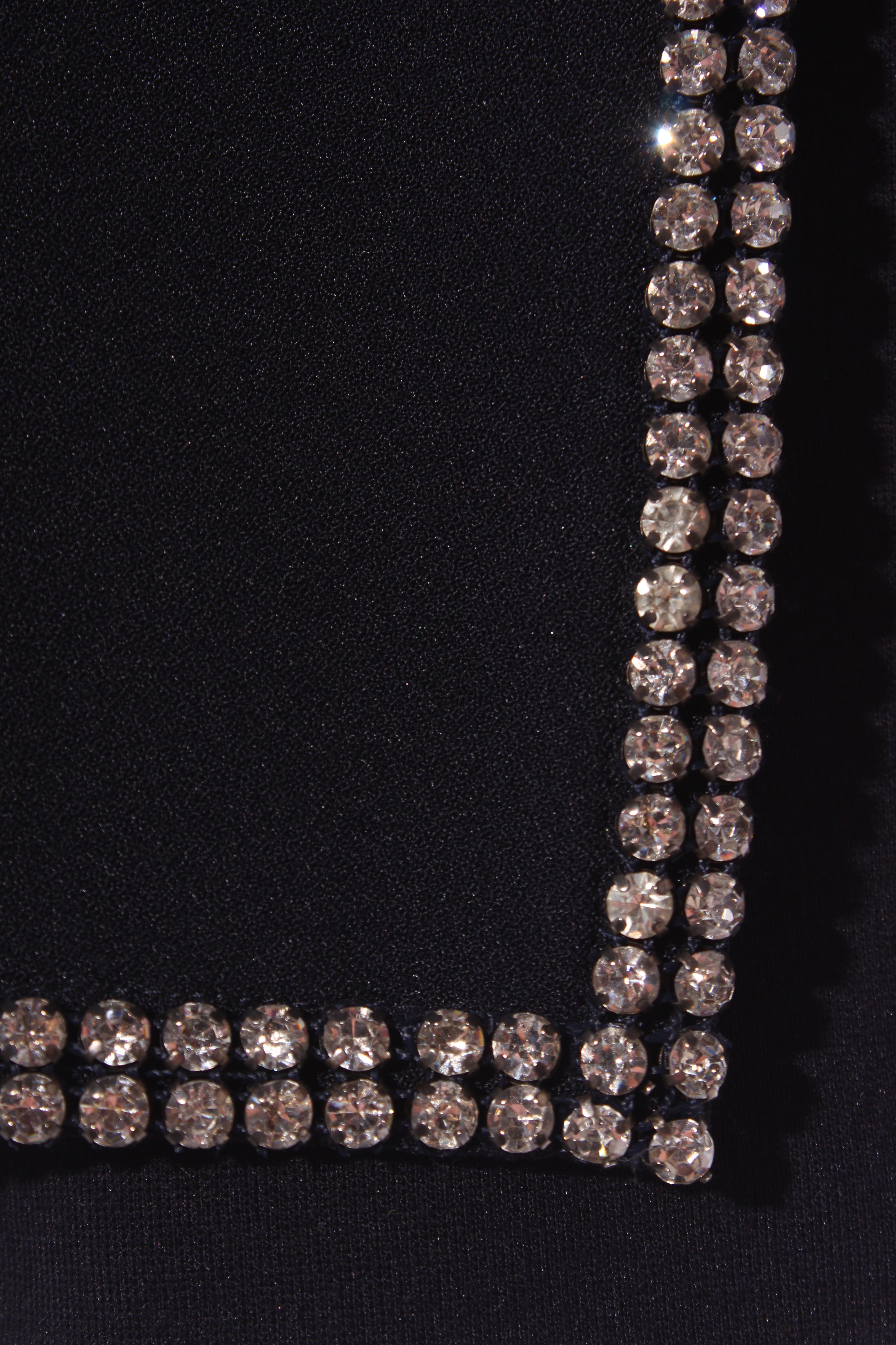 NOTES: A double row of sparkling crystals traces the overlay of an understated two-layer dress styled with a trim, sleeveless silhouette.