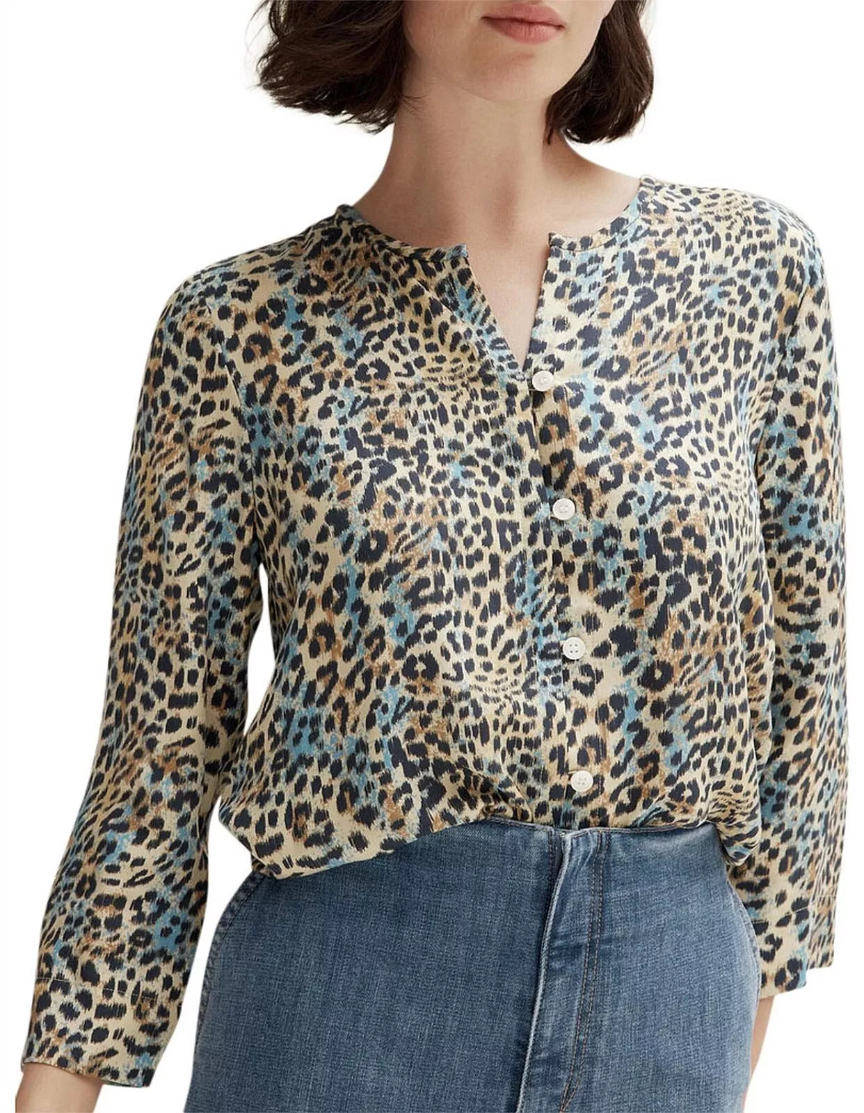 NOTES: This blouse is made from silky-soft modal, screen printed with a refreshing twist on timeless leopard. Neatly structured with a button-through placket, collarless design and cropped sleeve, it's the perfect new-season update for jeans, skirts and more.