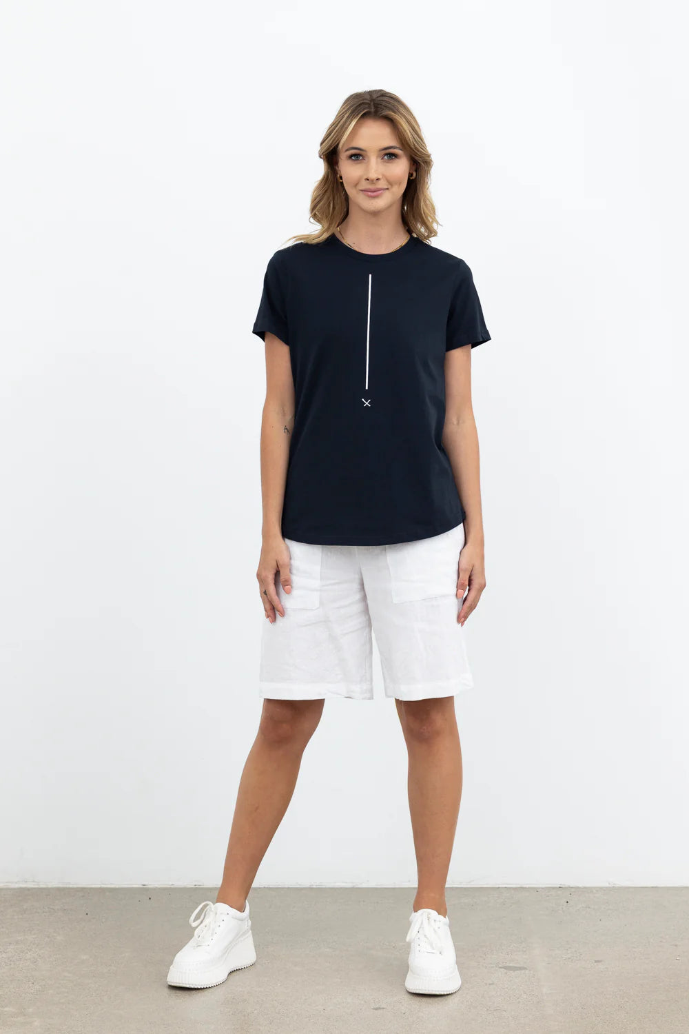 SIZE ON TAG: XLFITS LIKE: 16COLOUR: Navy blue, whiteFABRIC: CottonCONDITION: Like newMEASUREMENTS:BUST: 55cms WAIST: 55cms LENGTH: 69cmsNOTES: * Current seasonThe Scene Stealer Tee is a minimal...