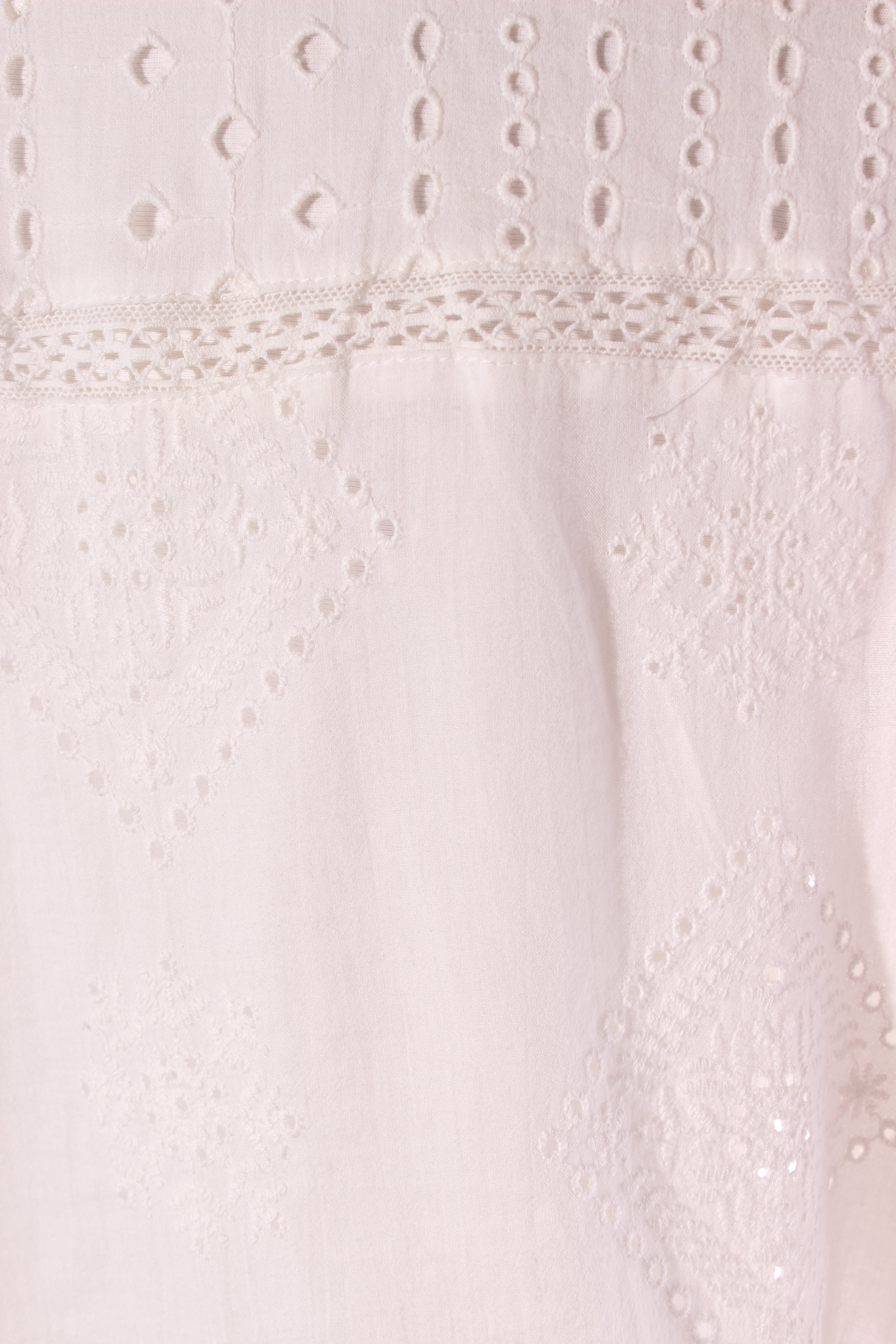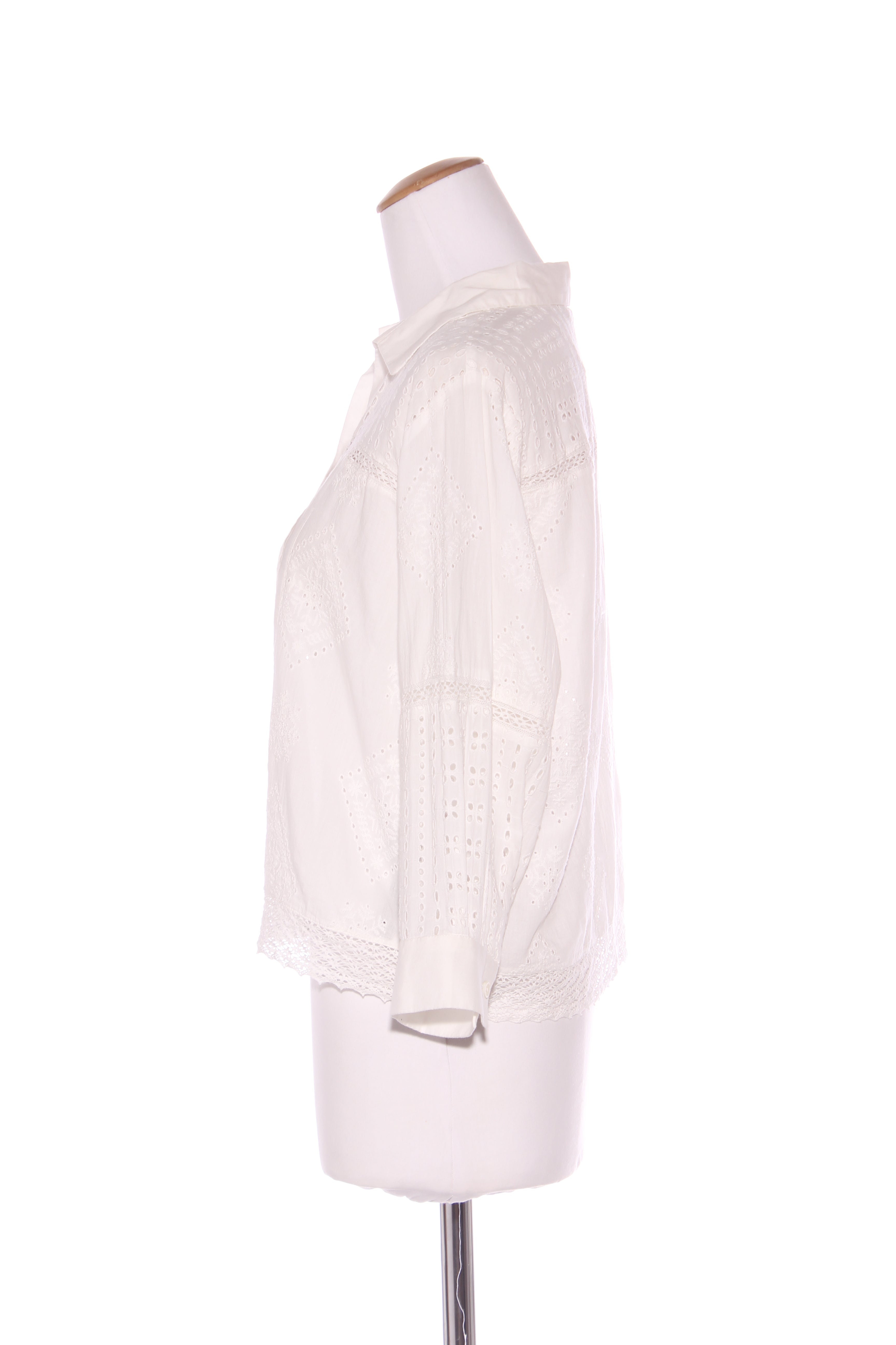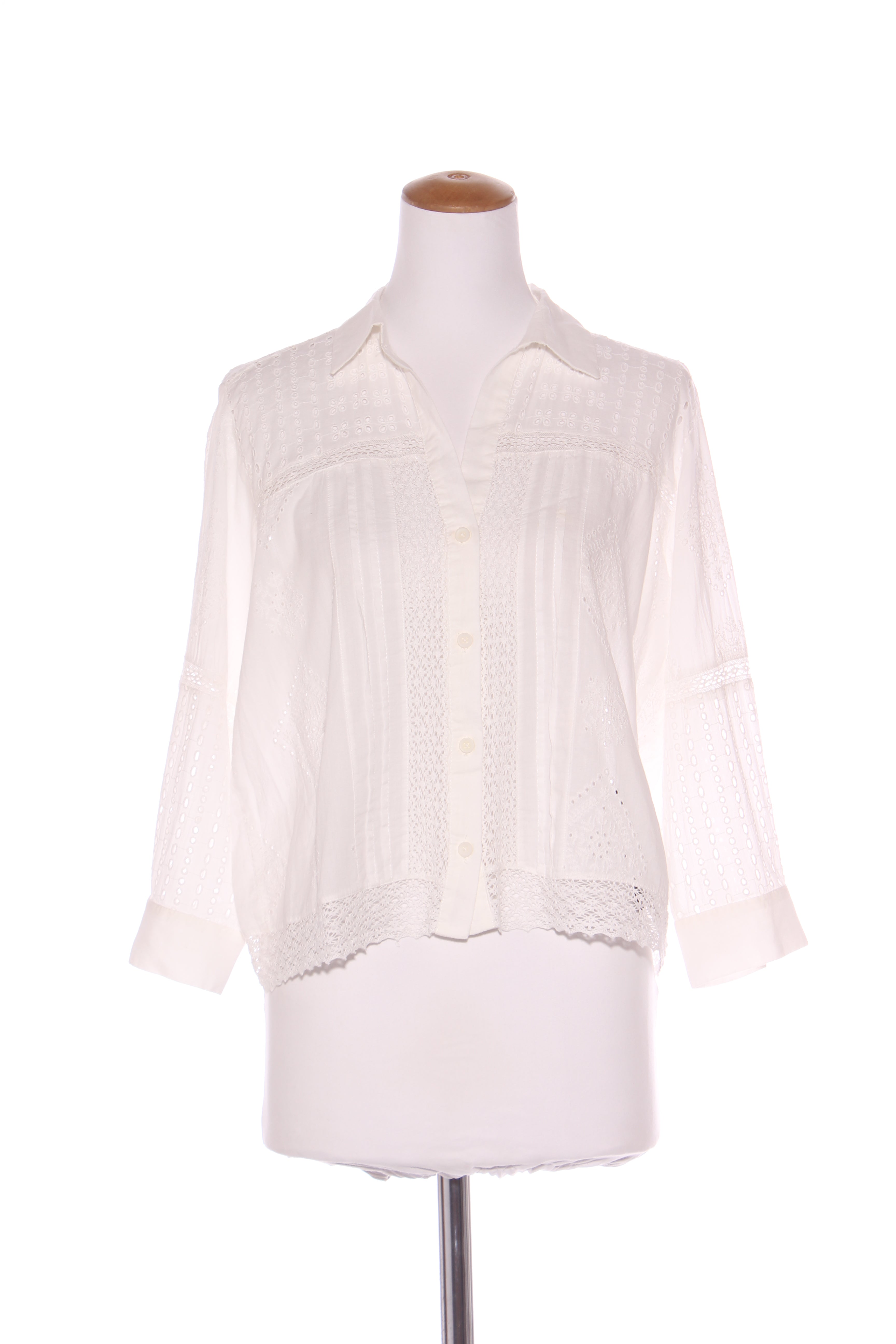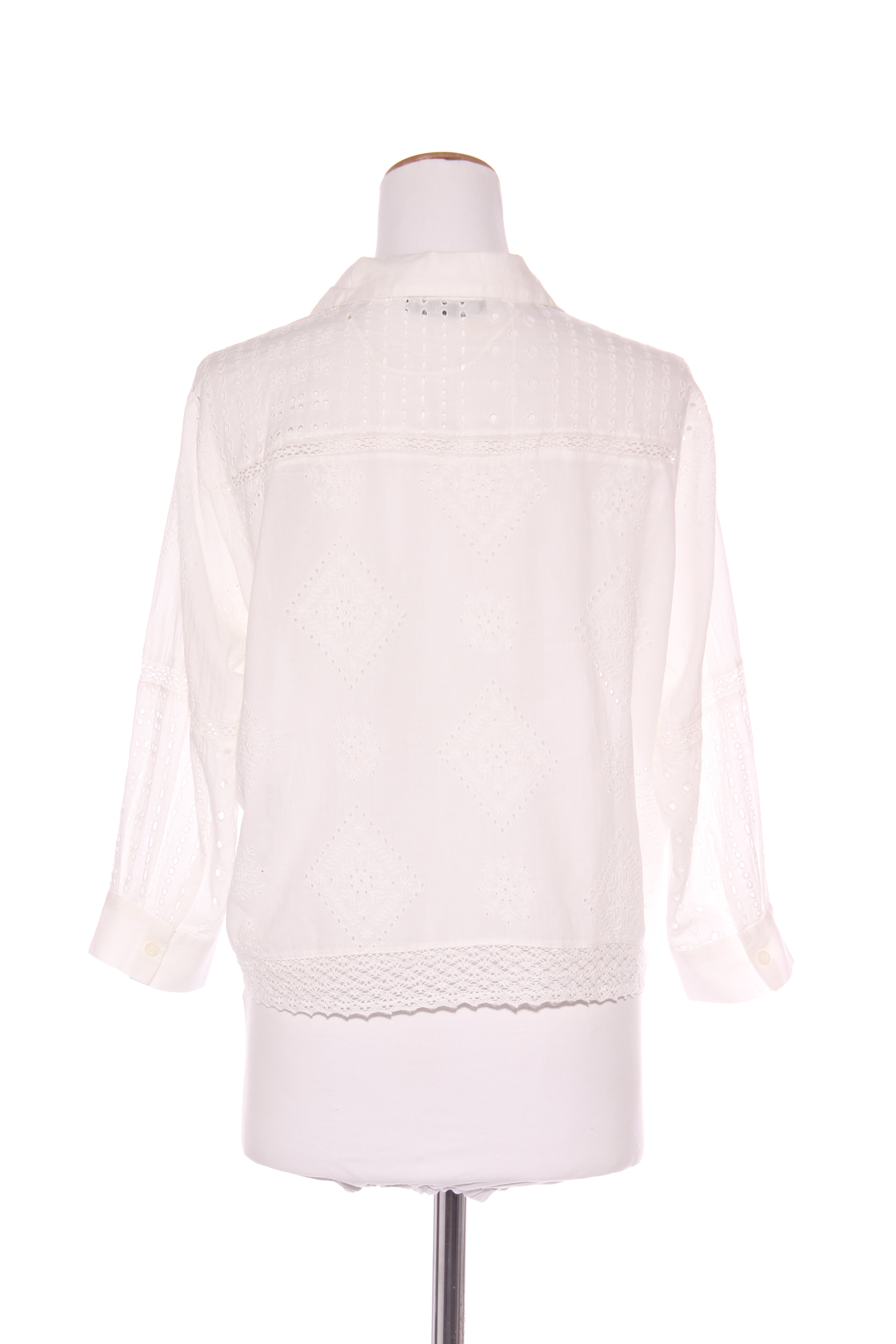 NOTES: Super pretty broderie anglaise and lace detail. Crop style. Light and airy cotton. Button up front and sleeve ends.
